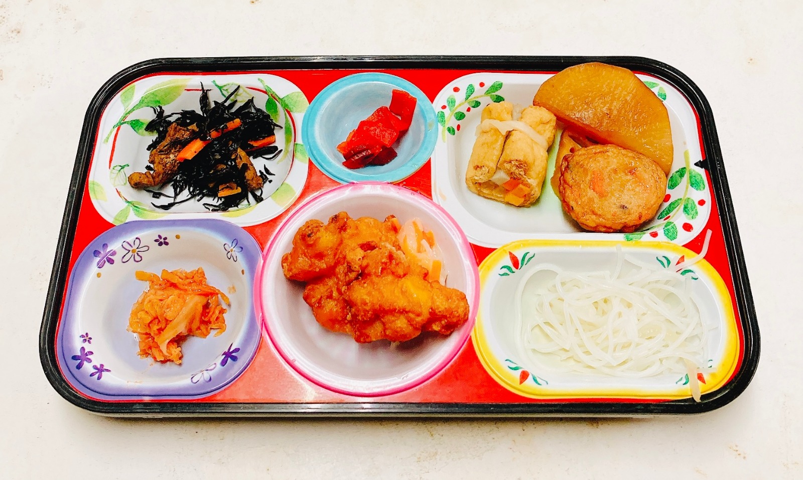 鶏モモ唐揚げエスカベッシュ、炊き合わせ(大根・信田巻き・半ぺん)ビーフン炒め、ひじき煮、キムチ