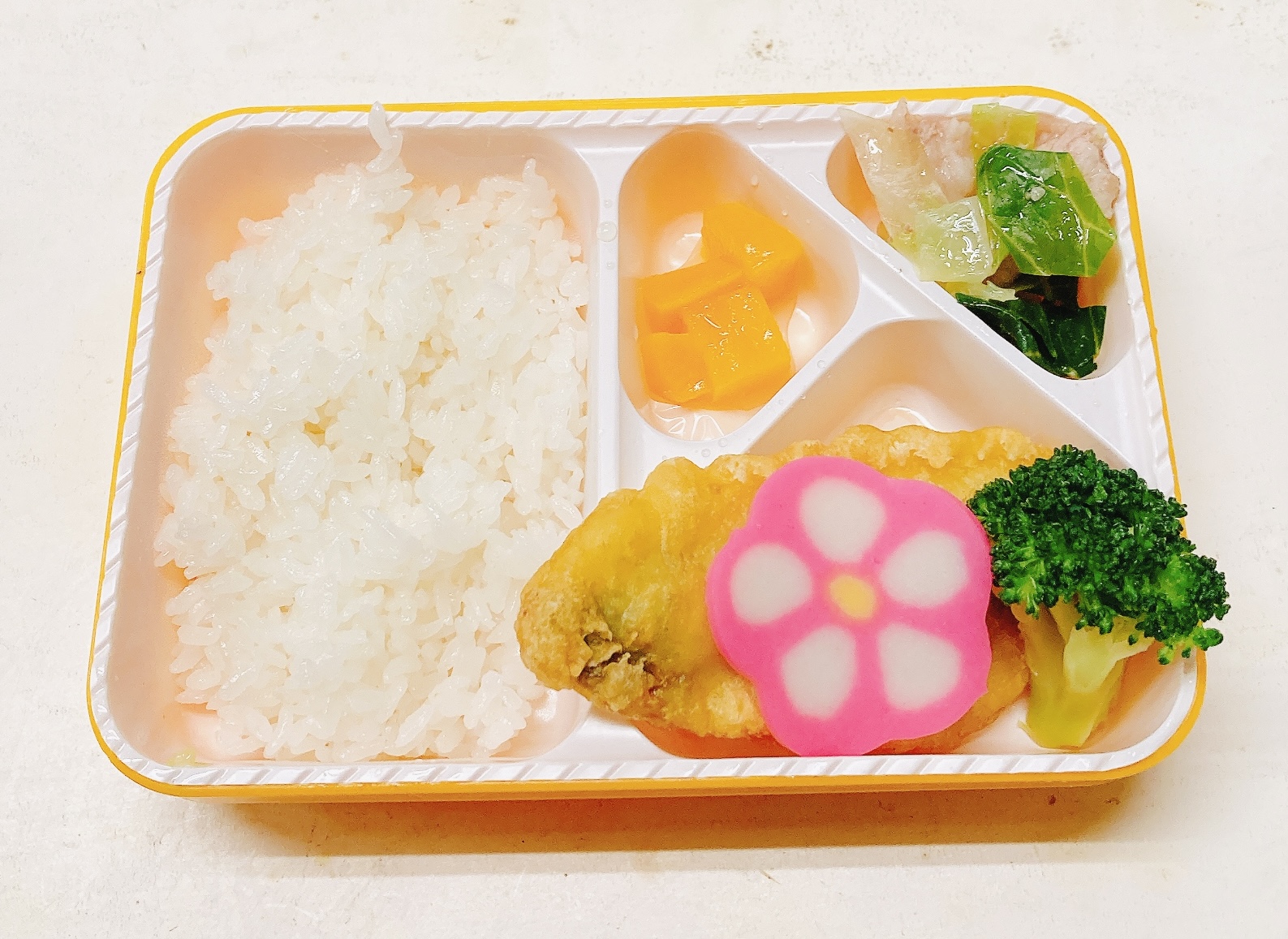 カキフライ、せんきゃべつ、タレ付き肉団子、竹の子かか煮、竹輪胡麻和え、ウインナー炒め、さつま芋と大豆煮物