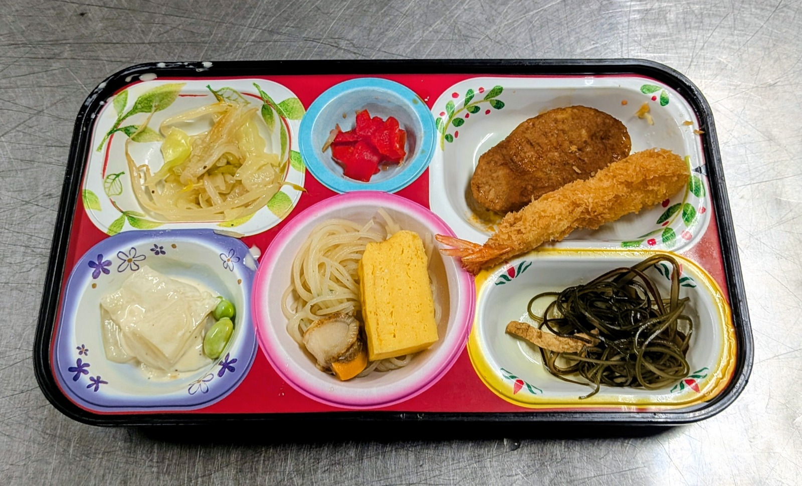エビフライ、煮込みハンバーグ、厚焼玉子、帆立サラダ、糸切昆布煮、野菜炒め、大根サラダ