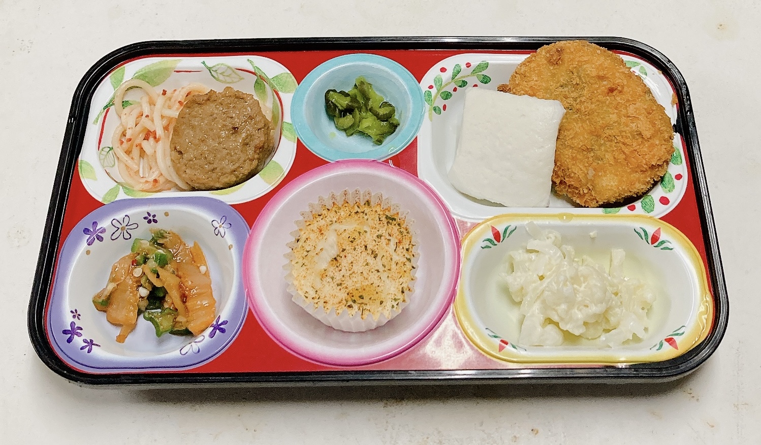 菜の花コロッケ、カップグラタン、ミニハンバーグ、白半ぺん、スパゲティー、カリフラワーサラダ、キムチオクラ