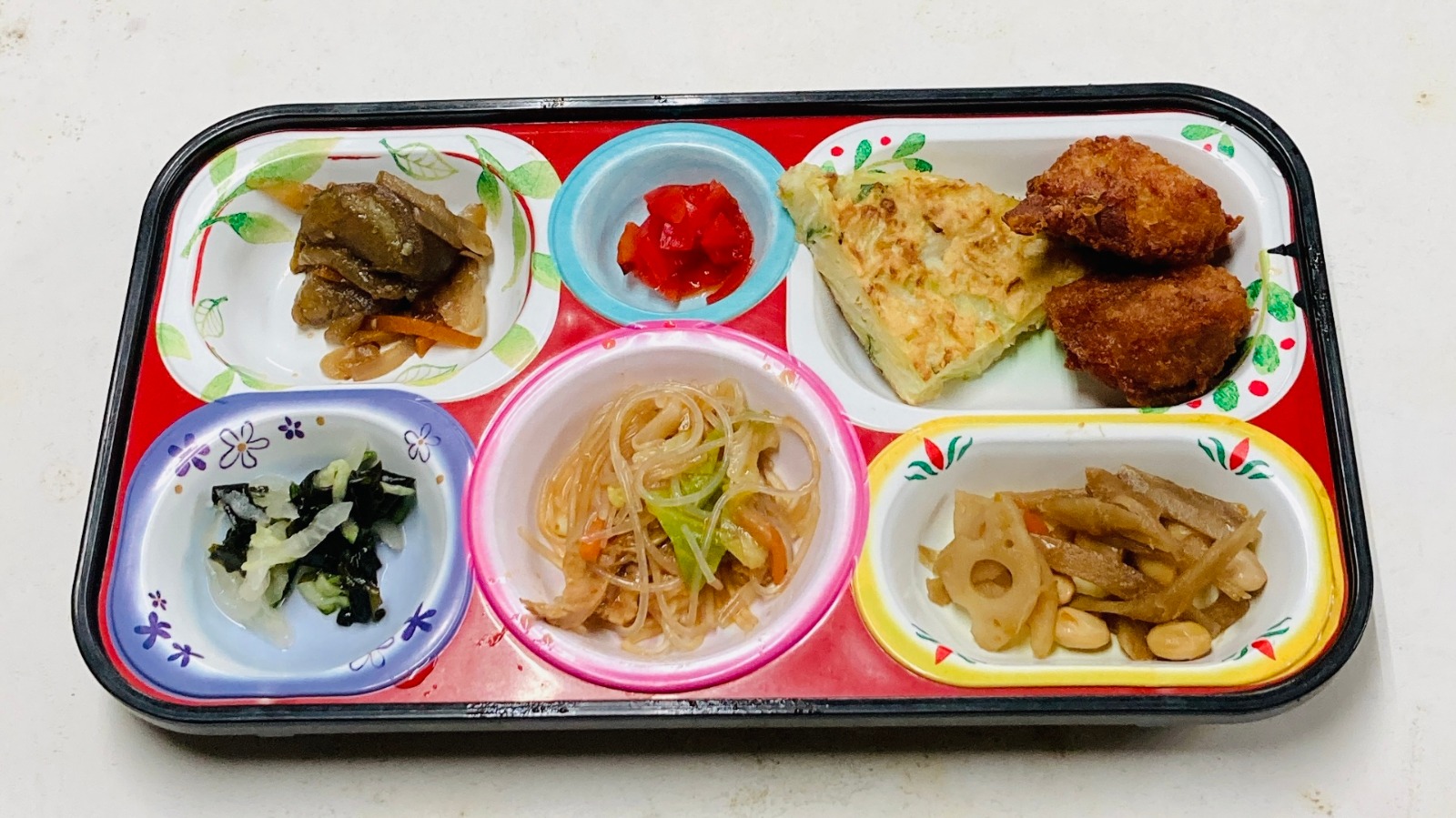 ハンバーグ、豚玉葱串カツ、サツマイモ天ぷら、南瓜小倉煮、サラダスパゲティー、牛蒡煮、切干大根煮