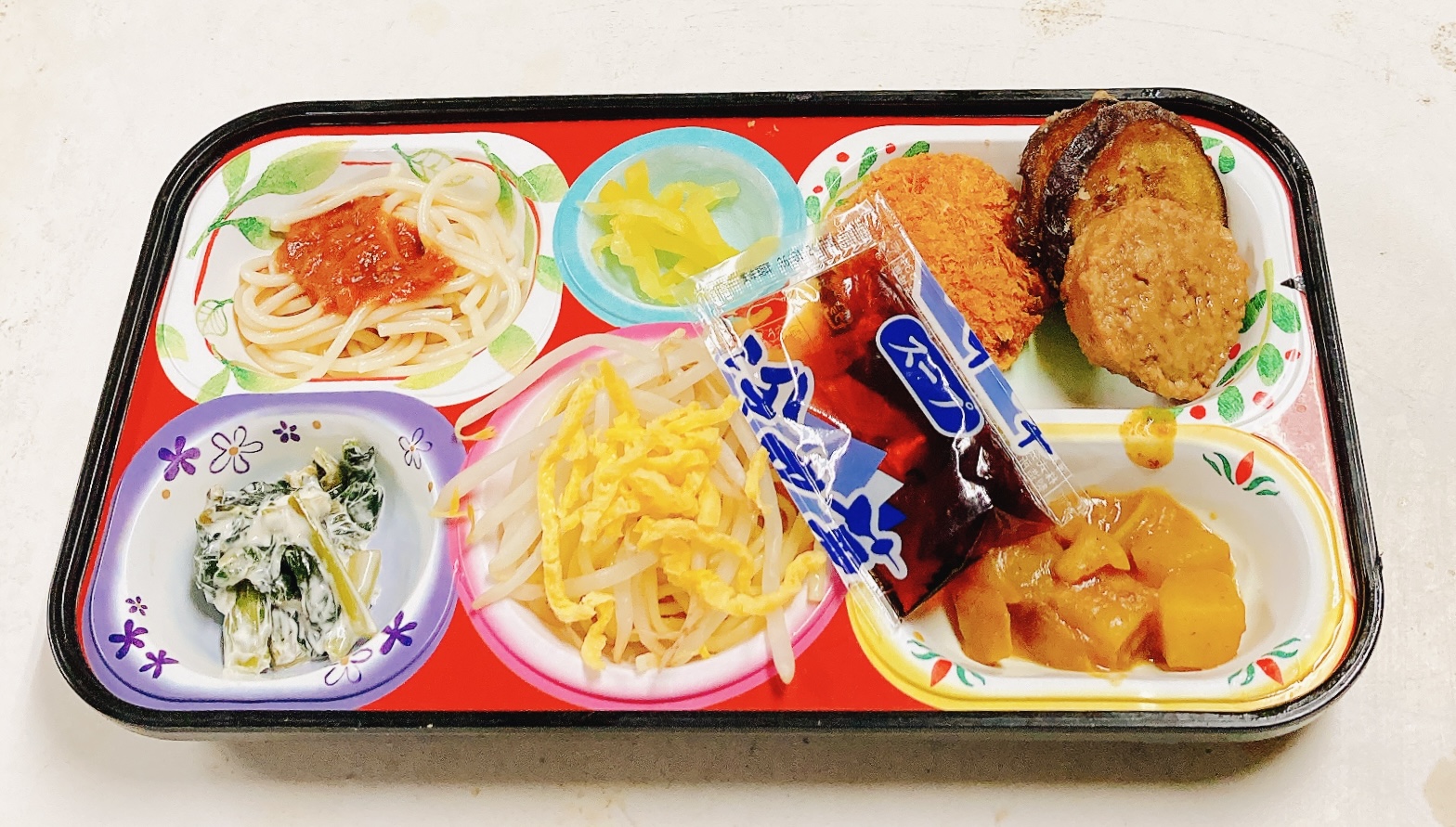 ツナマヨフライ、茄子はさみ揚げ、ミニハンバーグ、スパゲティーミートソース、ホーレン草マヨ和え、カレー