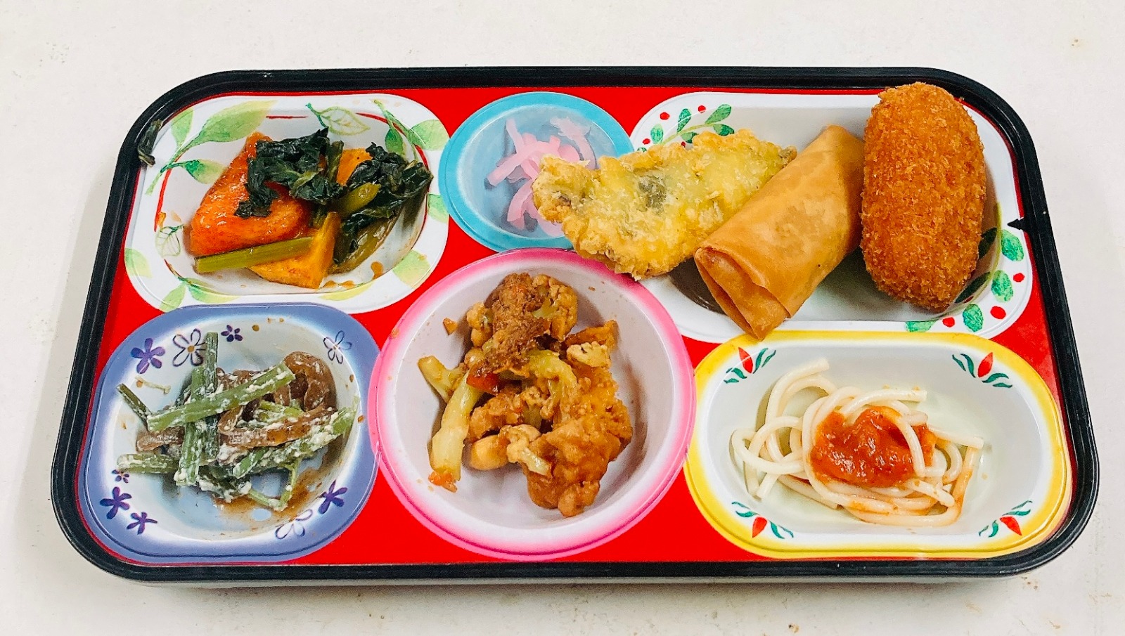 マヌルカンジャンチキン、五目巾着、薩摩揚げ、金平牛蒡、韓国風サラダ、バジルスパゲティー、ピーマンお浸し