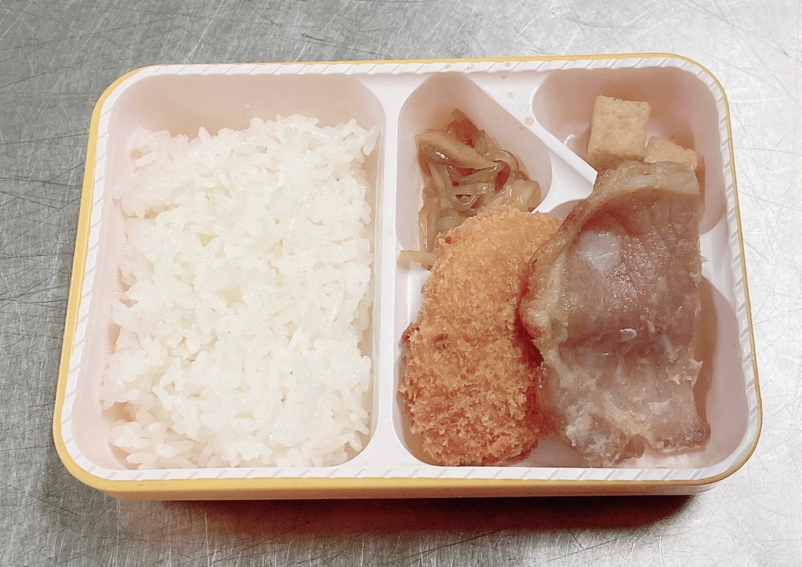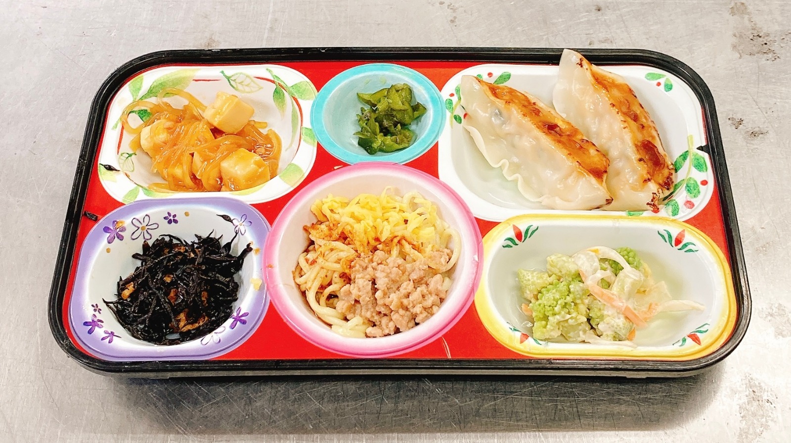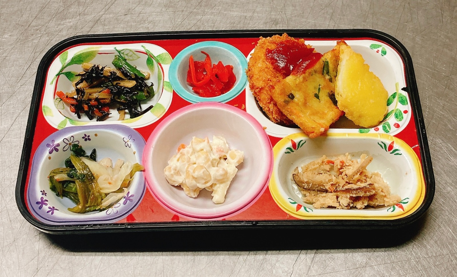 豚串カツ、竹輪磯辺揚げ、さつま芋天ぷら、チンジャオロース、明太スパゲティー、牛蒡味噌煮、セロリ浅漬け