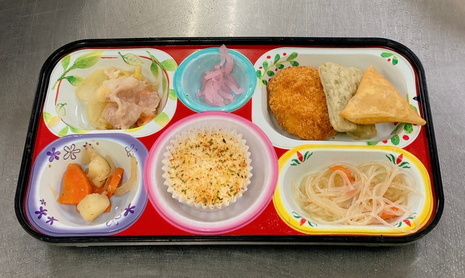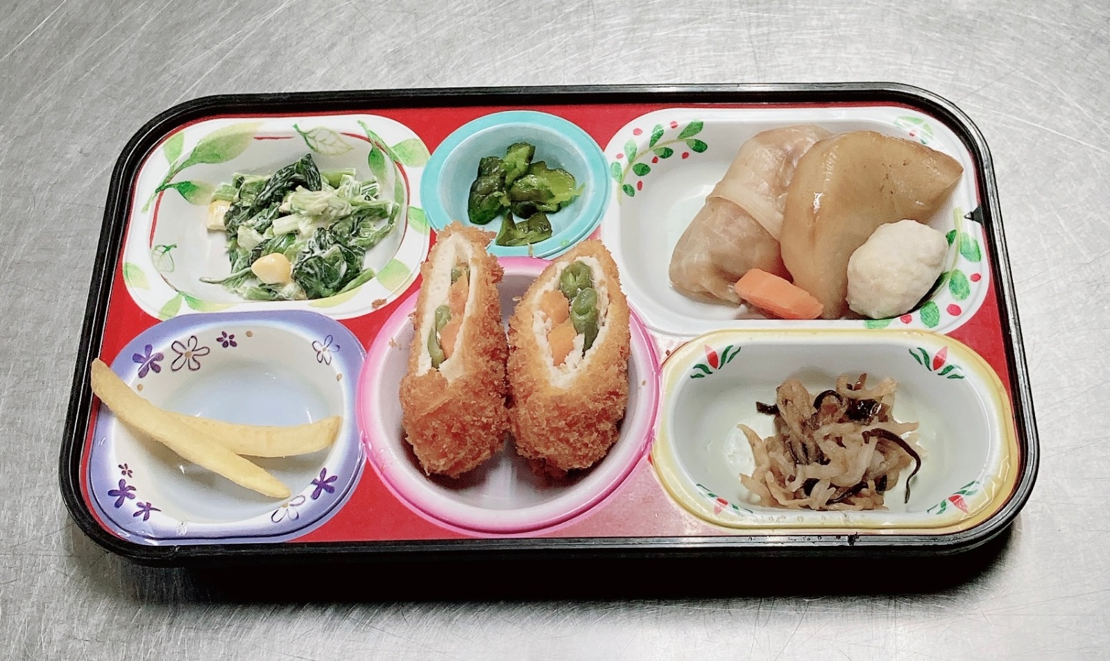 鶏肉野菜巻きフライ、炊き合わせ(ロールキャベツ・大根・人参・チキンボール)ホーレン草とコーンサラダ、切干大根汐昆布和え、フライドポテト