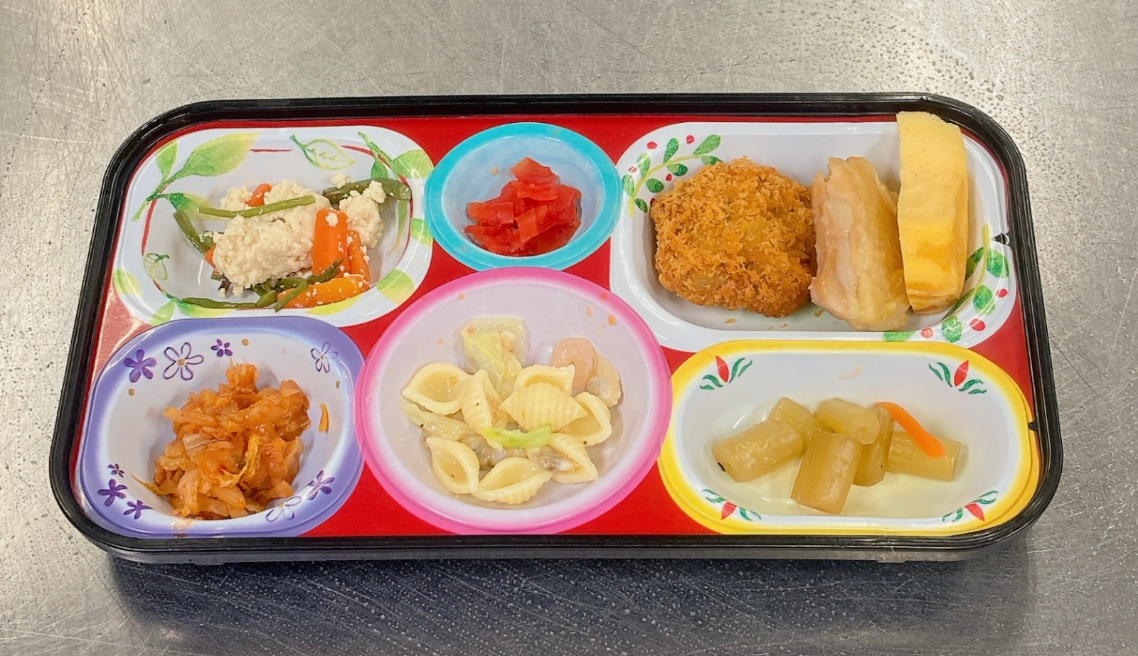 白身魚フライタルタルソース、インゲン天ぷら、菜の花しんじょう、三角豆腐天、ペンネミートソース、春キャベツとさつま芋煮物、おくら青紫蘇和え
