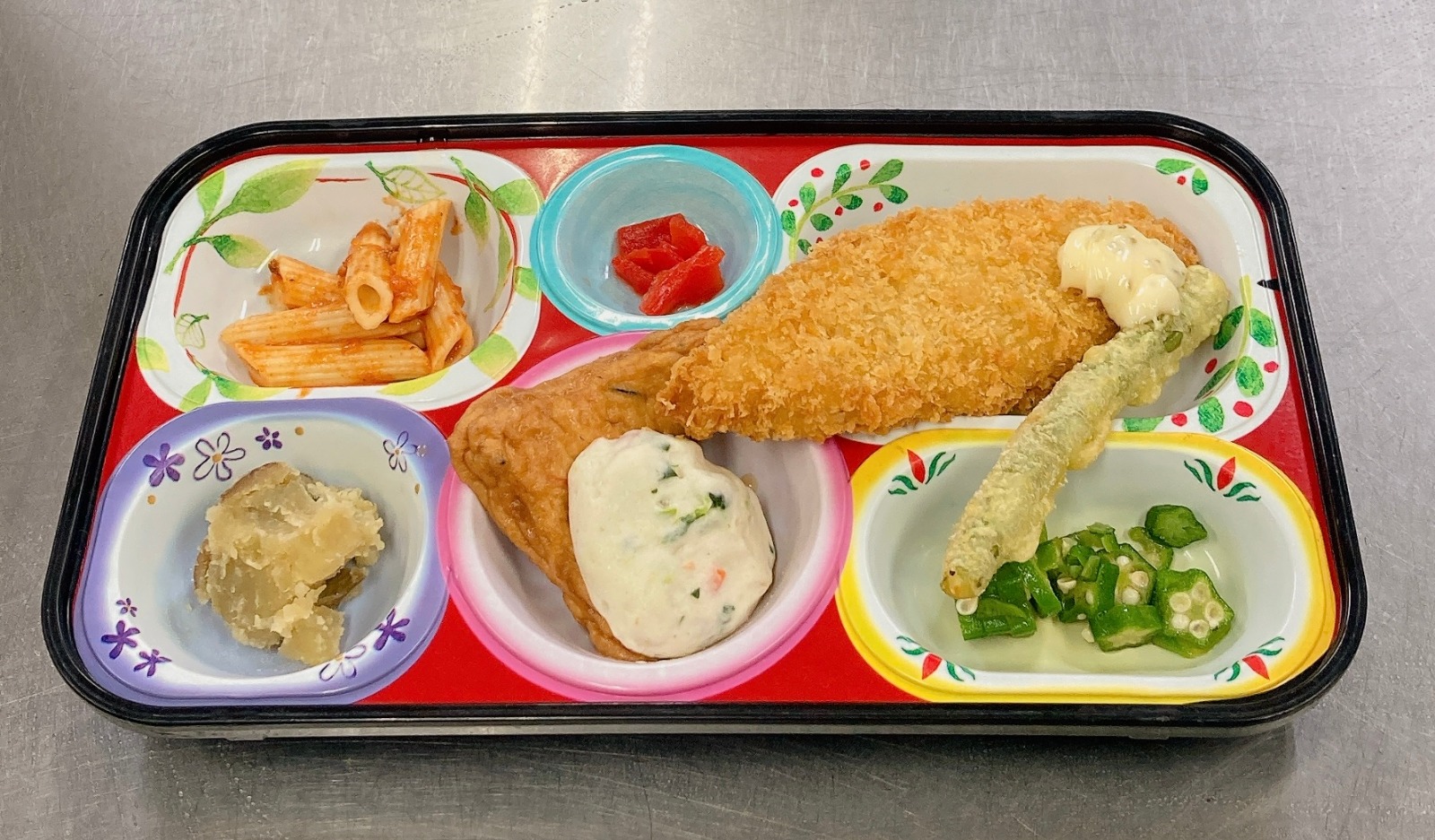 ピーマン肉詰めフライ、ホーレン草平焼き、竹輪磯辺揚げ、チキンボールコンソメ煮、すき焼き風煮、マカロニサラダ、ふきナムル