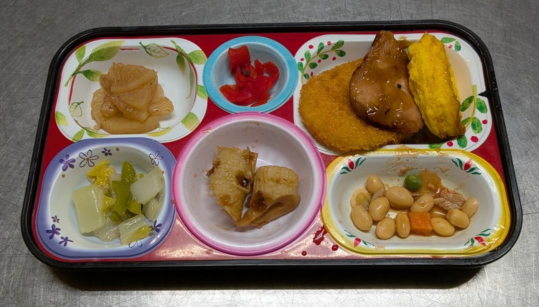 野菜コロッケ、照り焼きサラダチキン、オムレツ、竹輪カレー煮、ポークビーンズ、チョレギ和え、豚バラ大根煮