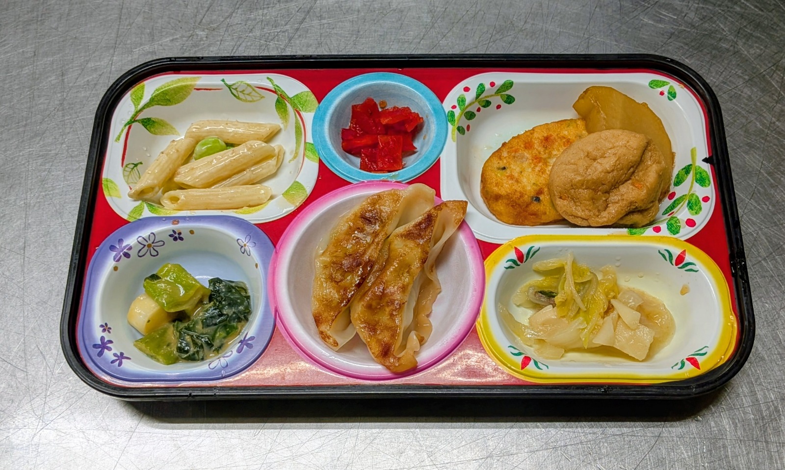 豆腐ステーキ・大根・がんも、焼餃子、ペンネツナサラダ、八宝菜風煮、酢味噌和え