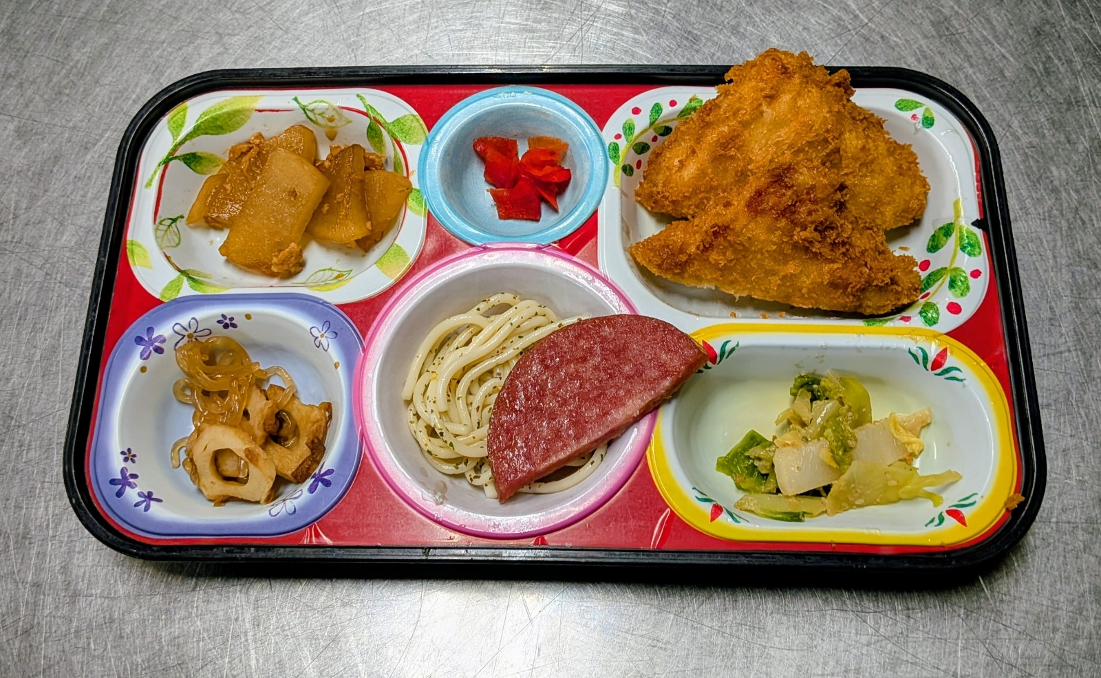 チキンカツ、スパゲティー、焼ハム、そぼろ煮、白菜胡麻和え、糸蒟蒻と竹輪煮物