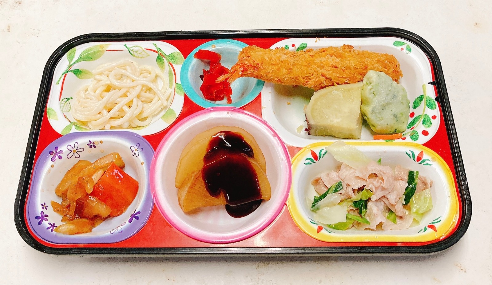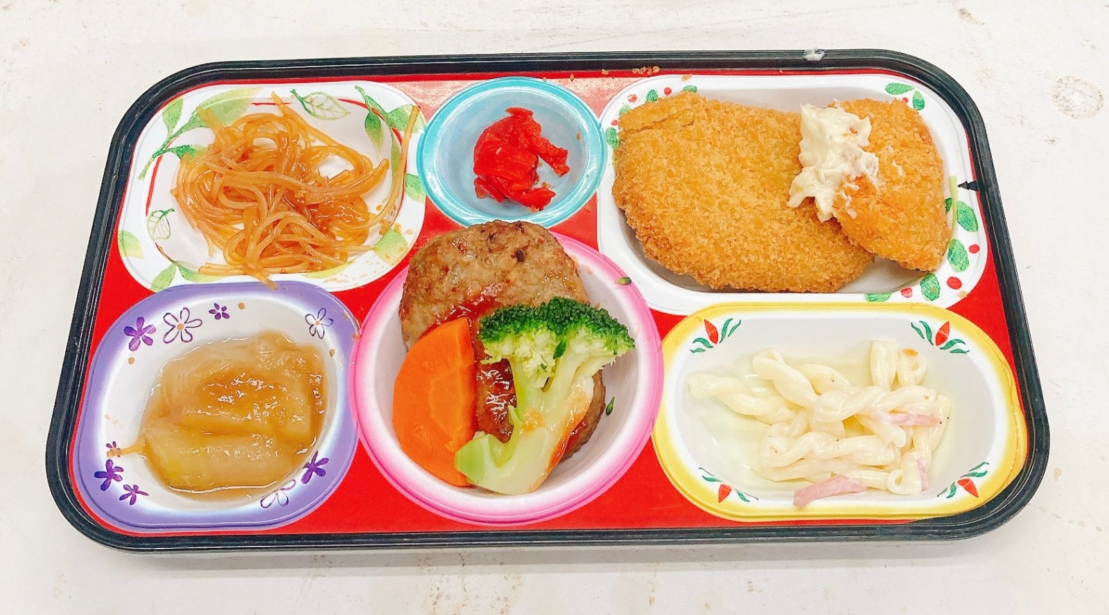 ハンバーグトマトソース、人参・ブロッコリー、北あかりコロッケ、アジフライタルタルソース、麻婆春雨、冬瓜あんかけ煮、ハムサラダ