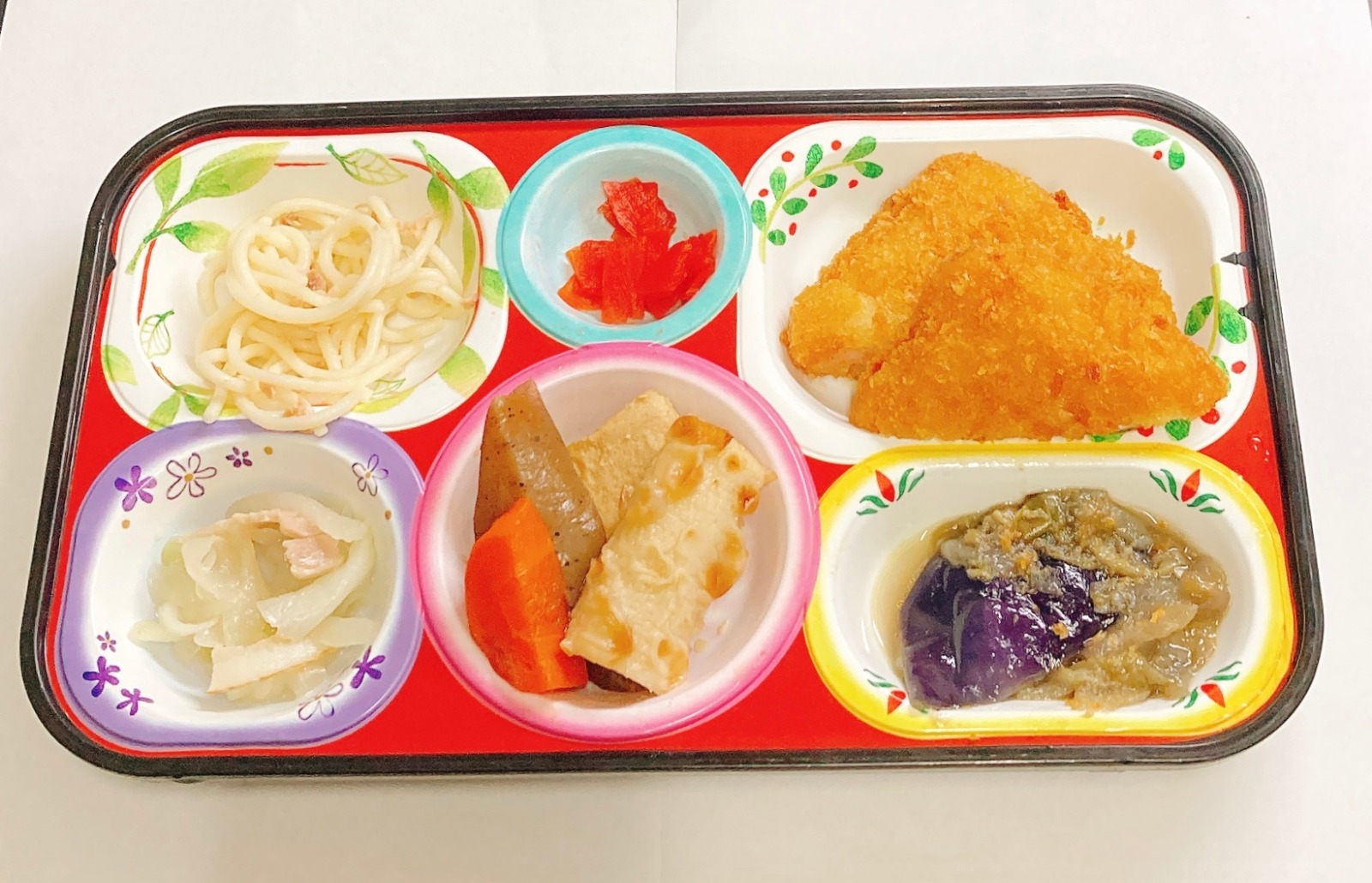 海老カツ、炊き合わせ(高野豆腐・蒟蒻・人参・竹輪)茄子煮、ツナ和え、根菜サラダ