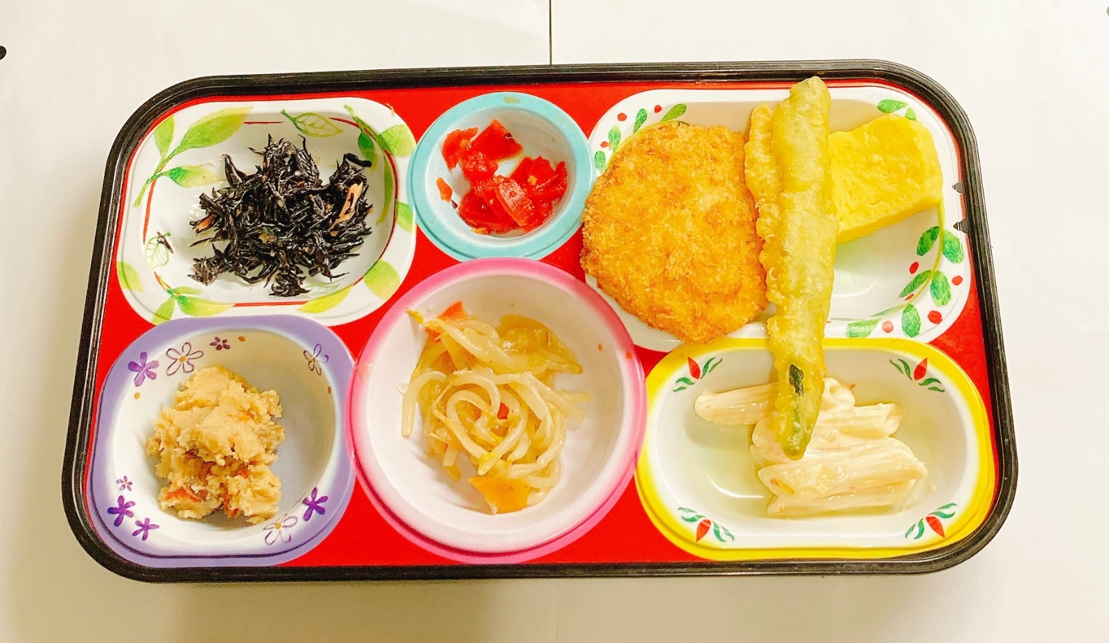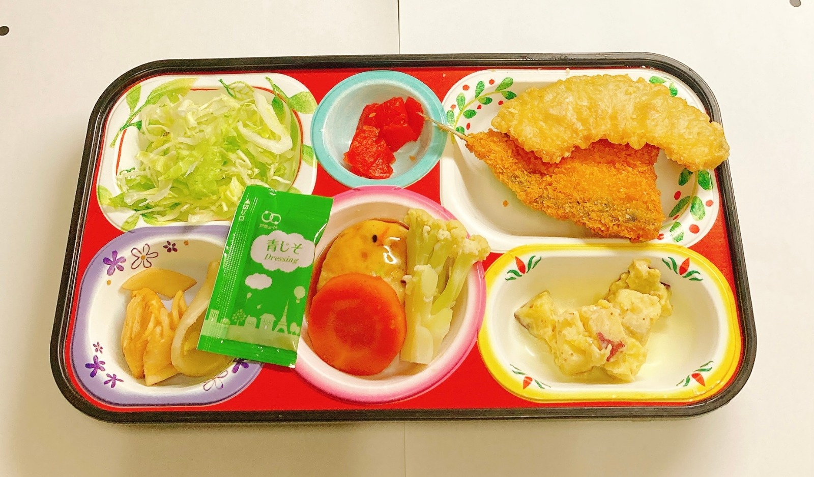 豆腐ハンバーグ・スティックカリフラワー・人参、アジフライ、南瓜天ぷら、生野菜、竹の子煮、さつま芋サラダ
