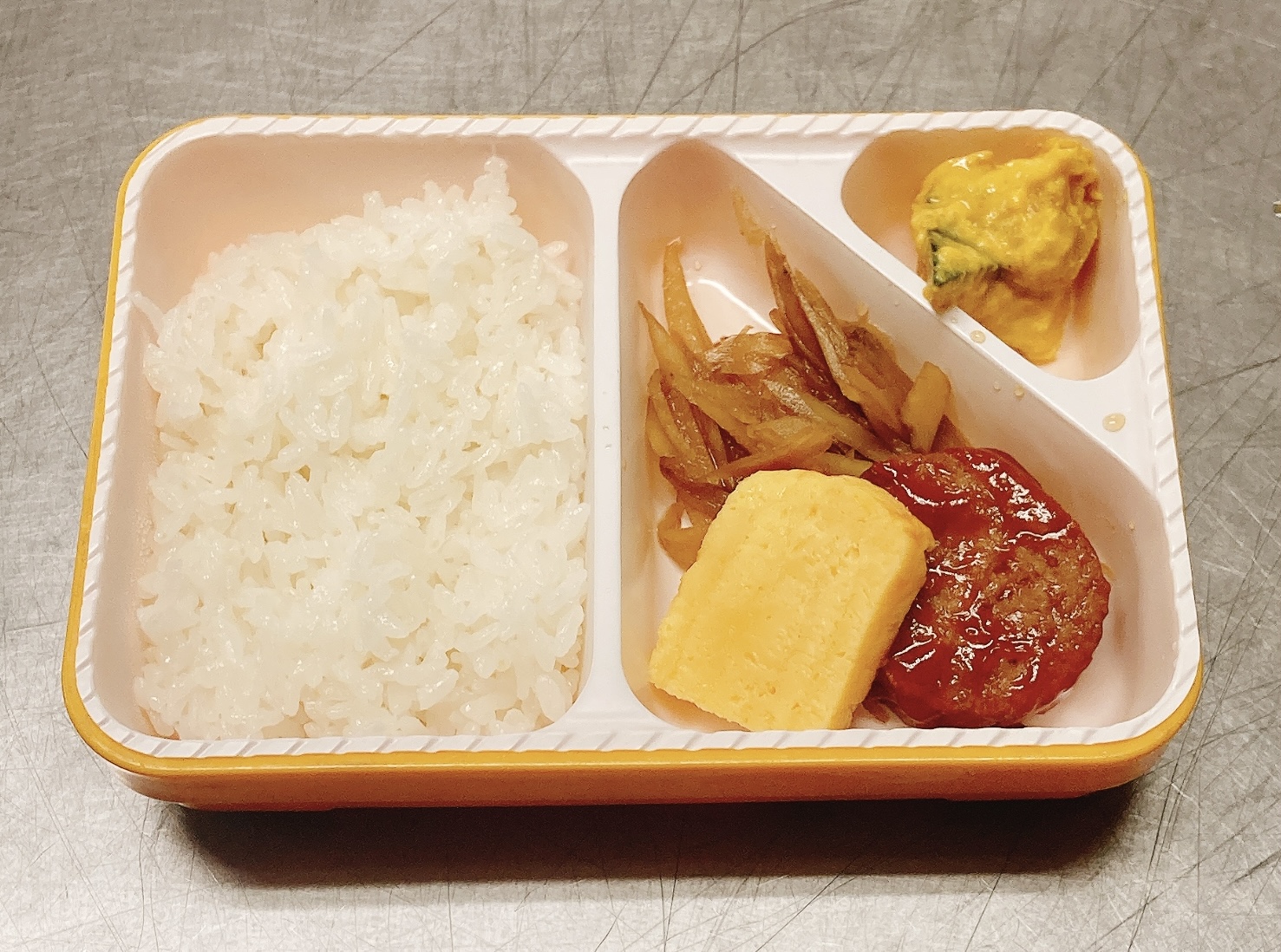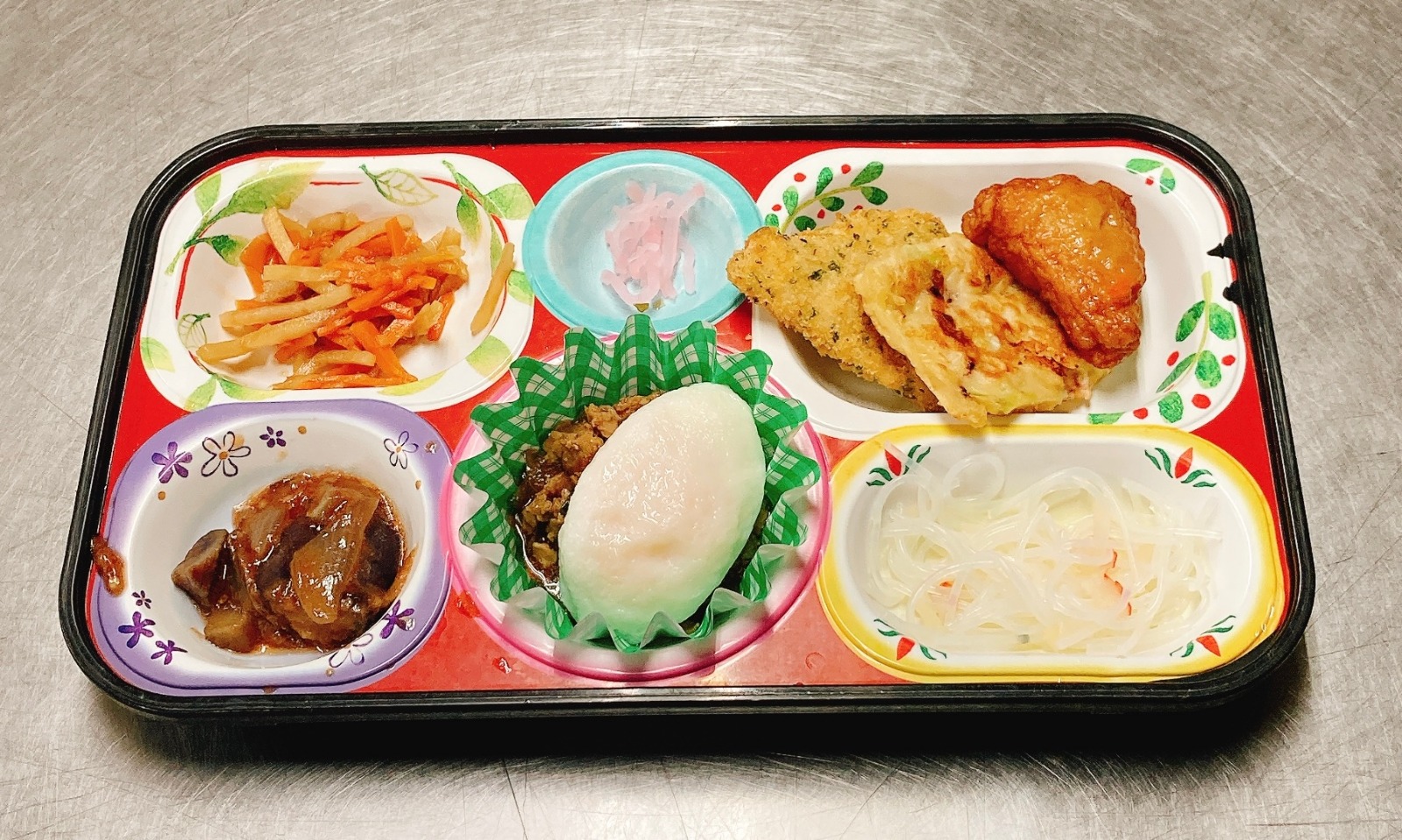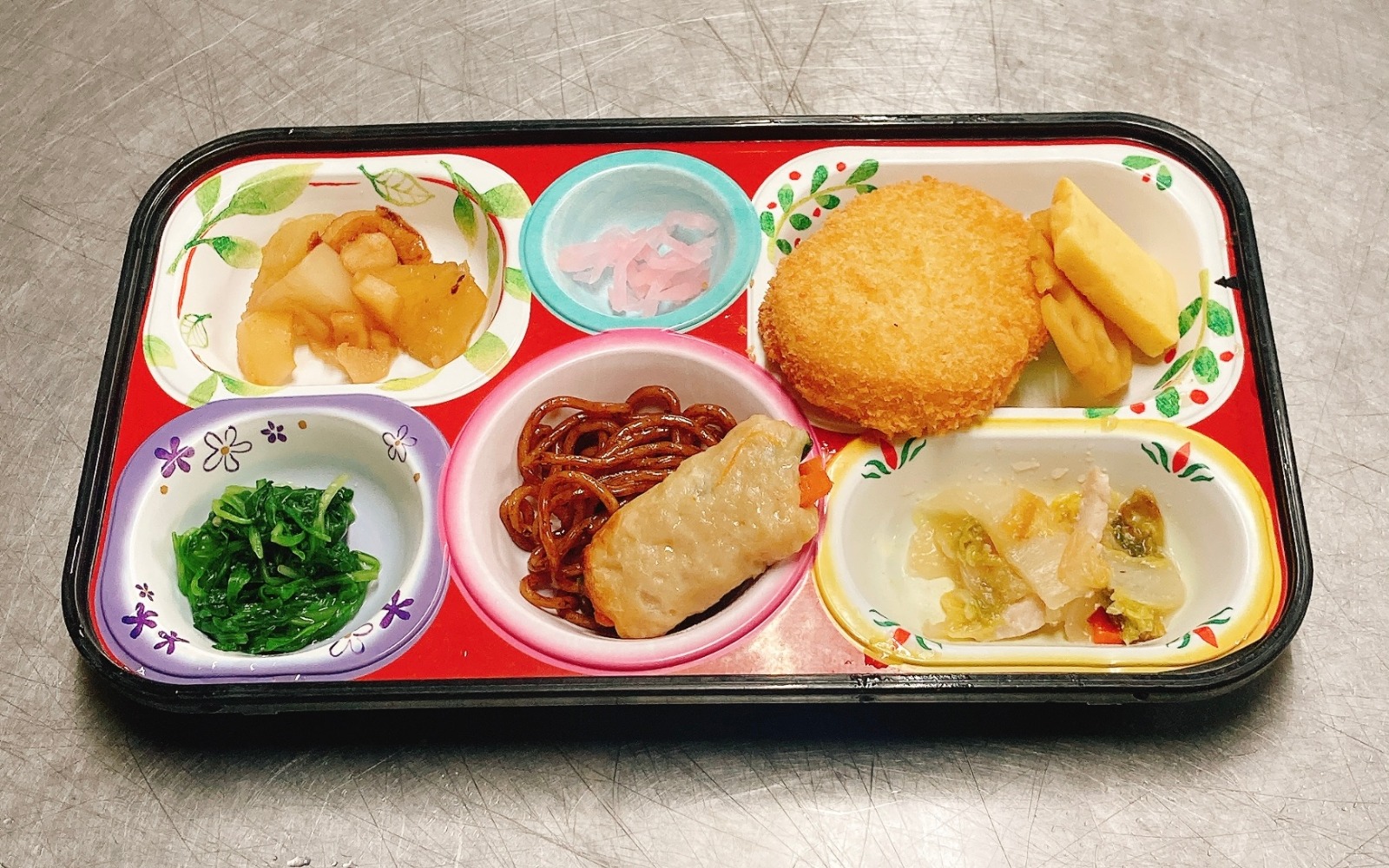 北あかりコロッケ、鶏野菜肉巻き、蓮根カレー煮、厚焼玉子、上海焼きそば、大根と筍煮物、ぬき菜お浸し、白菜塩炒め