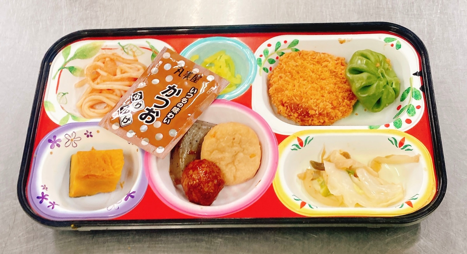 鶏金平カツ、タレ付き肉団子、高菜饅頭、がんも・三角蒟蒻、スパゲティーナポリタン、ホーレン草胡麻和え、南瓜煮