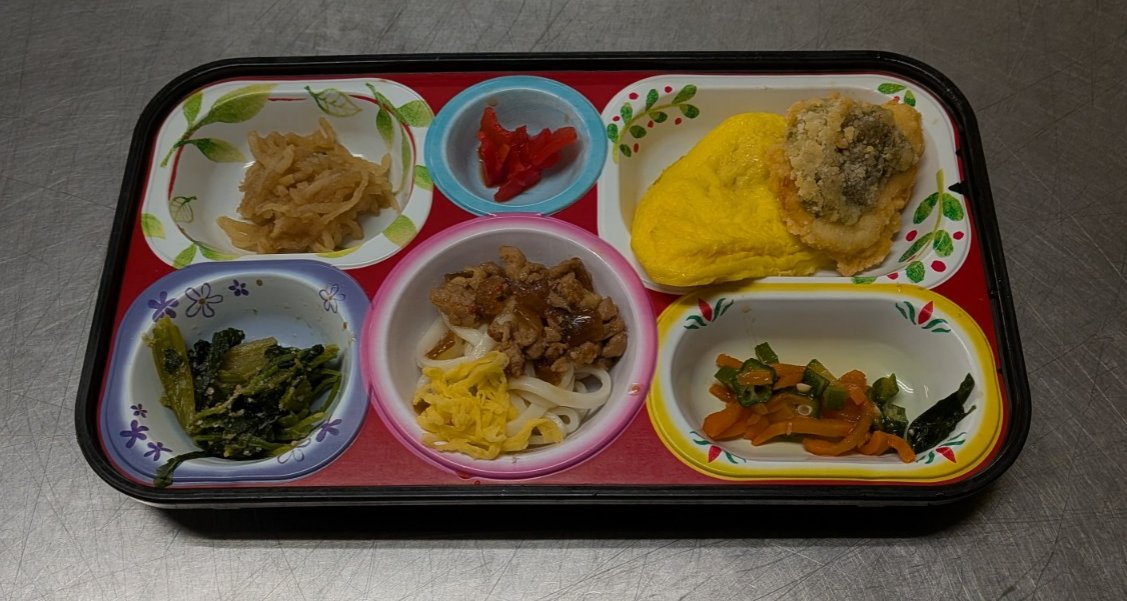 アジアンヌードル、梅紫蘇竜田揚げ、ミートオムレツ、ホーレン草胡麻和え、切干大根味噌煮、オクラ和え物