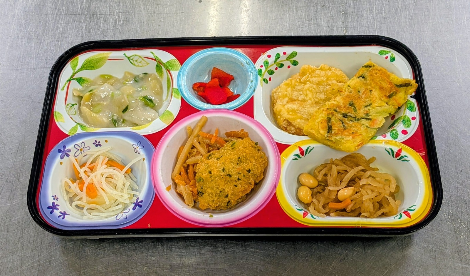 カブクリーム煮、鯖磯フライ、さつまいも天ぷら、チヂミ、ビーフン炒め、大豆煮、柳川風煮