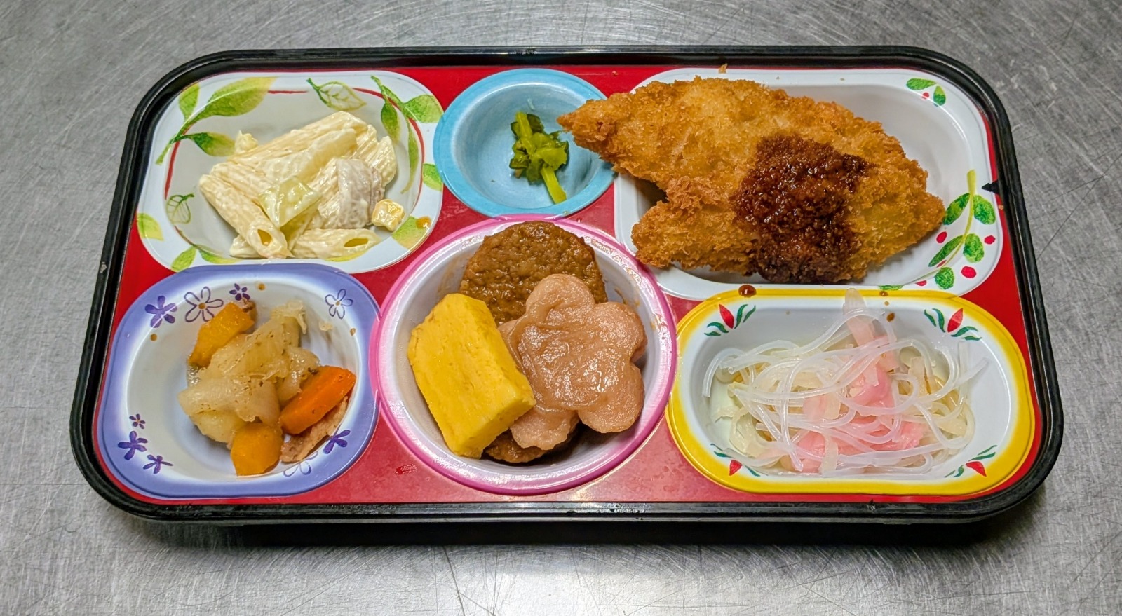 白身魚背脂ダレ、煮込みハンバーグ、厚焼玉子、花さつま、ペンネサラダ、肉じゃが、春雨酢の物