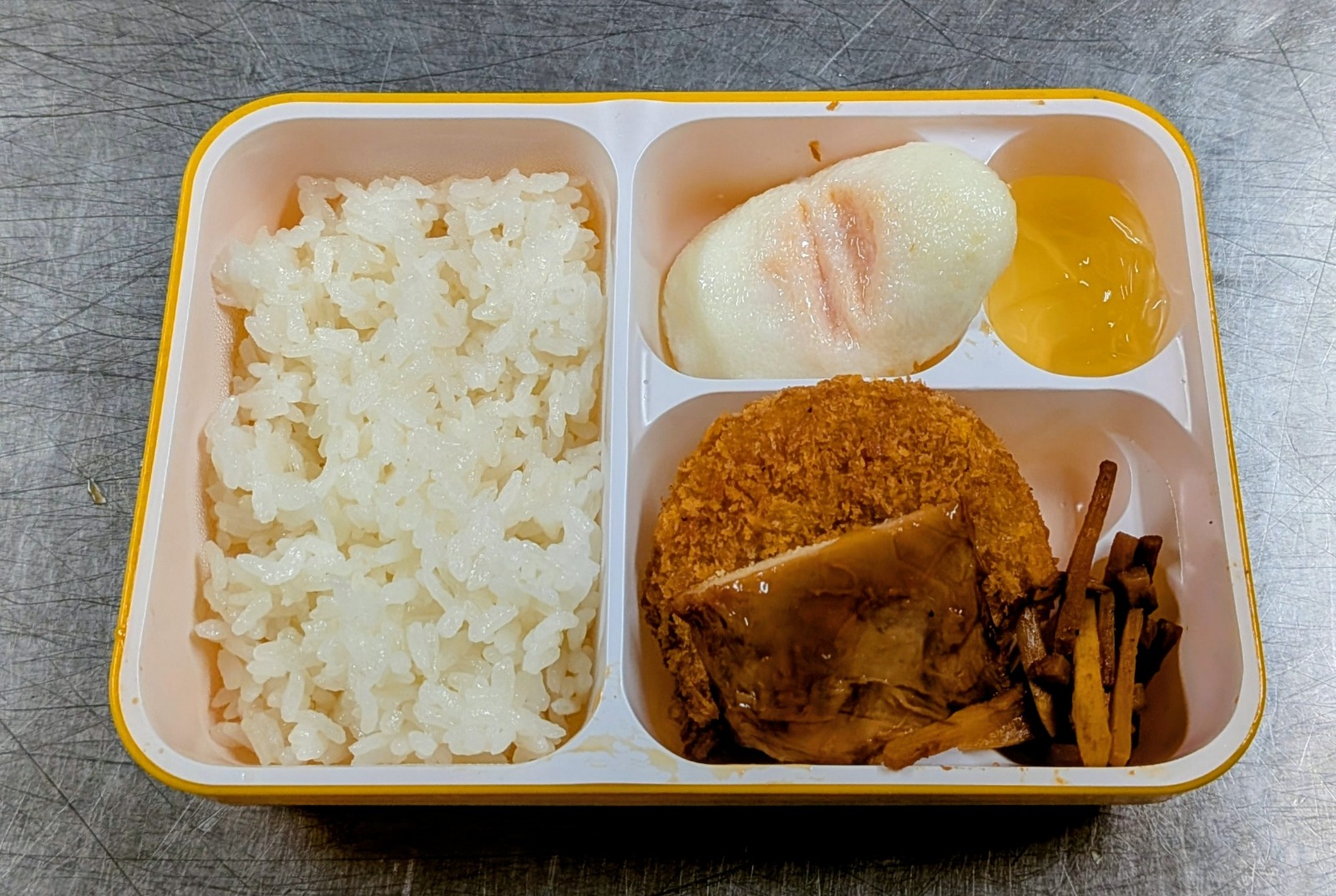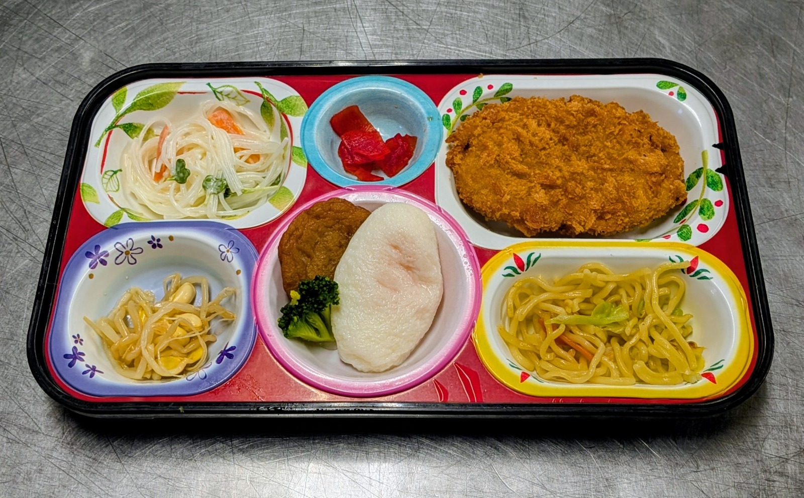 すき焼き風コロッケ、焼そば、目玉焼き、揚げ半ぺん、春雨サラダ、大豆もやし