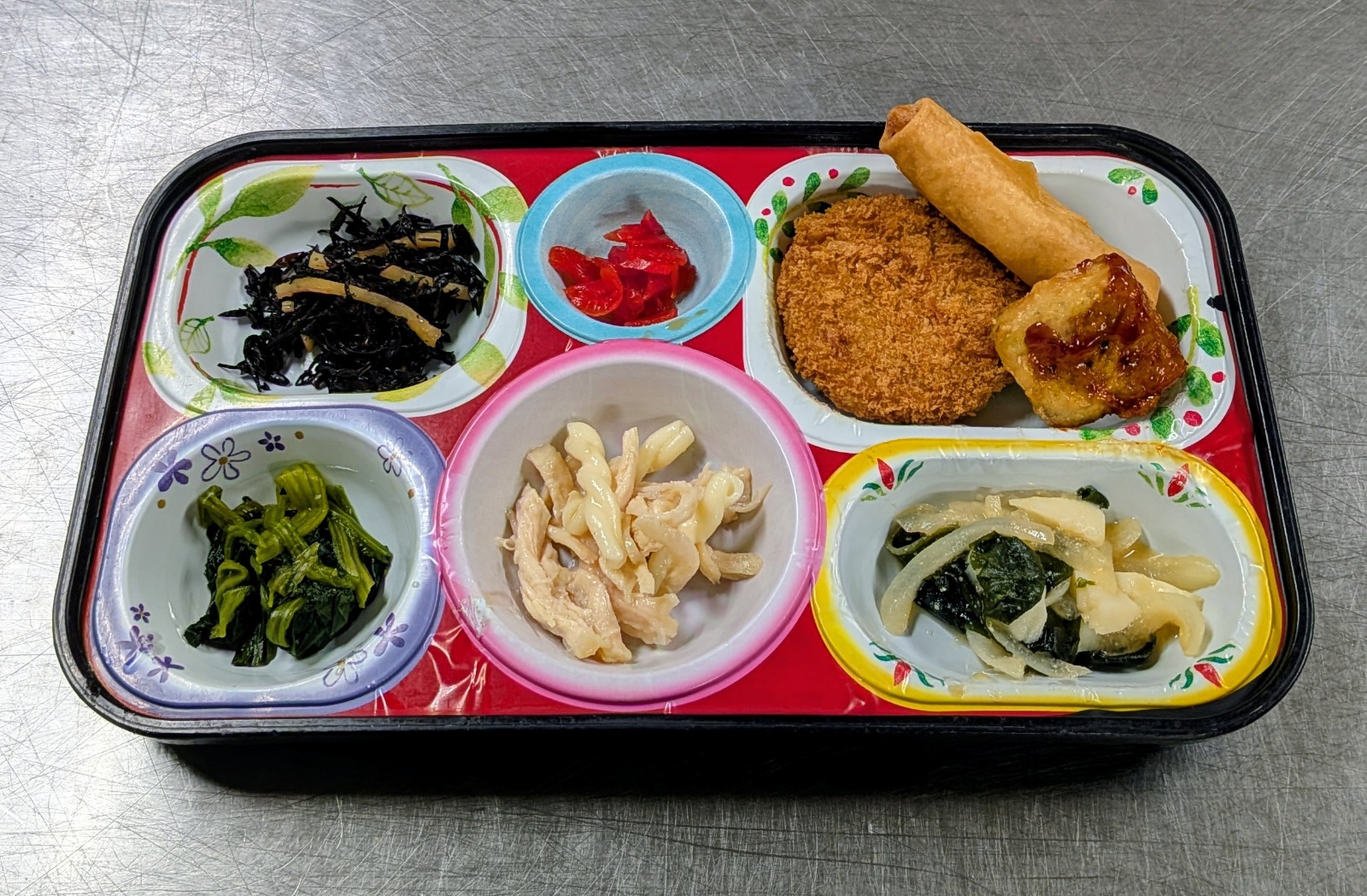肉じゃがコロッケ、鶏信田巻き、ミートオムレツ、豚しゃぶサラダ、焼きそば、牛蒡胡麻和え、ひじき煮