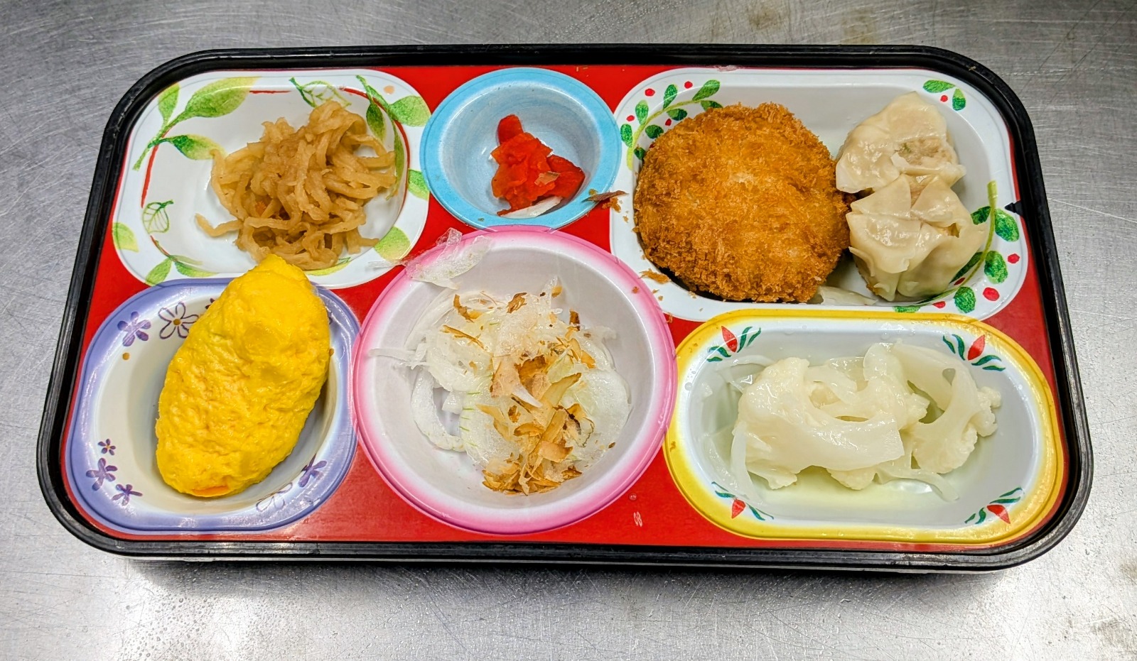 イカとオクラ彩りカツ、焼売、野菜オムレツ、焼きうどん、切干大根煮、カリフラワーサラダ、新玉葱