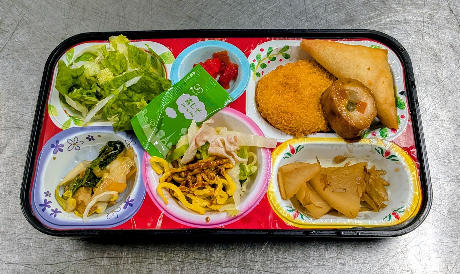 エビフライ、肉野菜巻き、△薩摩揚げ、竹の子味噌炒め、牛蒡かか煮、高野豆腐煮物、ビビンバ