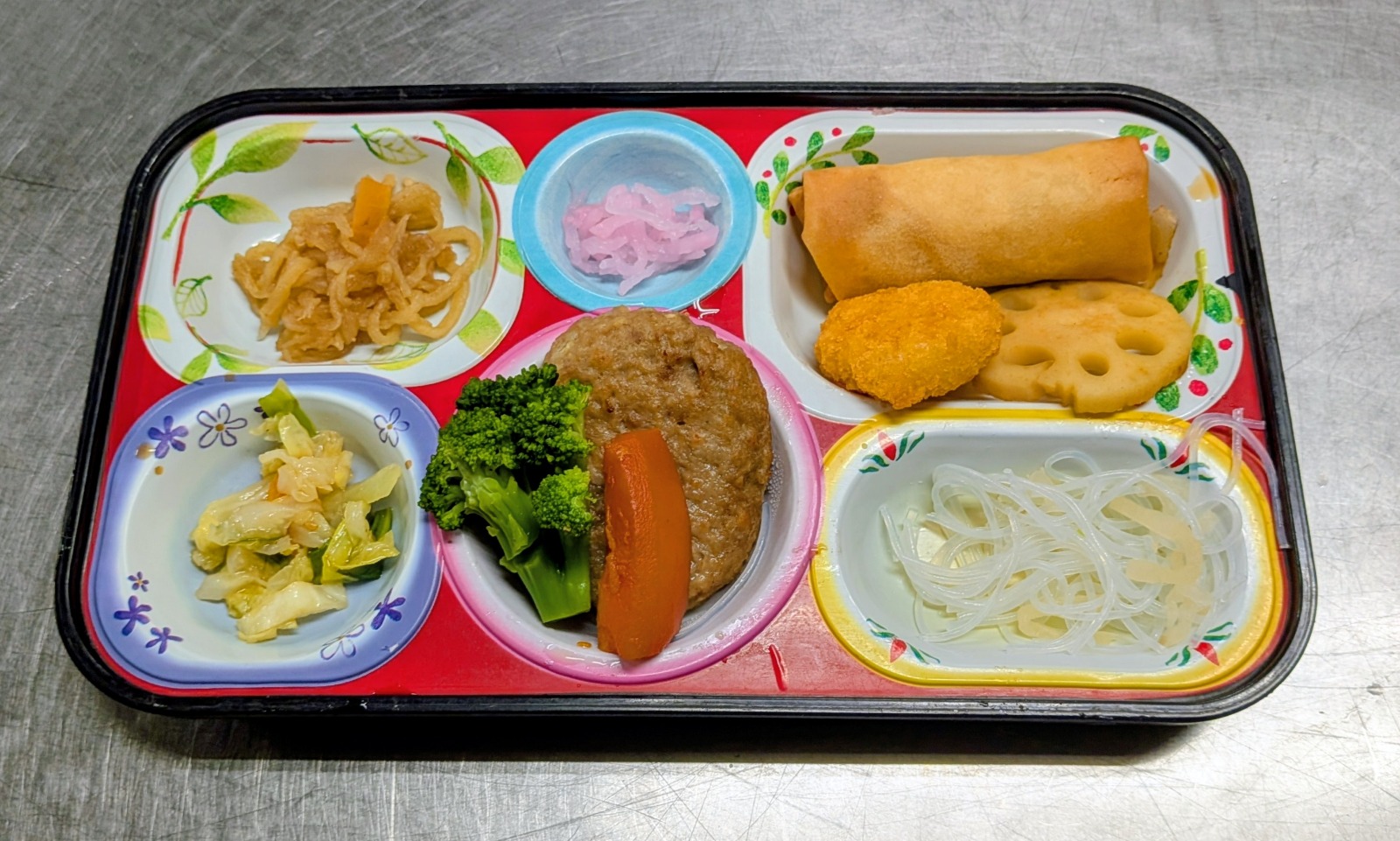 ハンバーグ・人参・ブロッコリー、野菜春巻き、帆立風味フライ、カレーレンコン、春雨酢の物、韓国風サラダ、切干大根煮