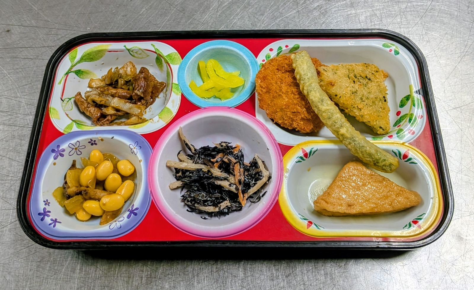 ヒレカツ、三角チーズポテトフライ、インゲン天ぷら、豚トロ炭火焼和え物、ひじきサラダ、大豆カレー煮