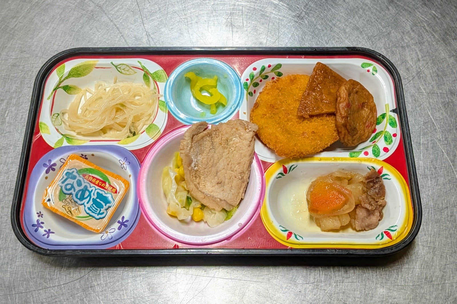 野菜コロッケ、茹で豚、牛蒡紅生姜揚げ半、味付油揚げ、キャベツとコーンサラダ、肉じゃが、春雨山葵和え、なめ茸