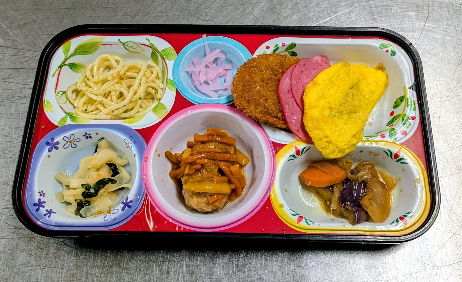 鶏牛蒡メンチカツ、ボロニアソーセージ、オムレツ、肉団子あんかけ、スパゲティーペペロンチーノ、茄子トマト煮、酢味噌和え