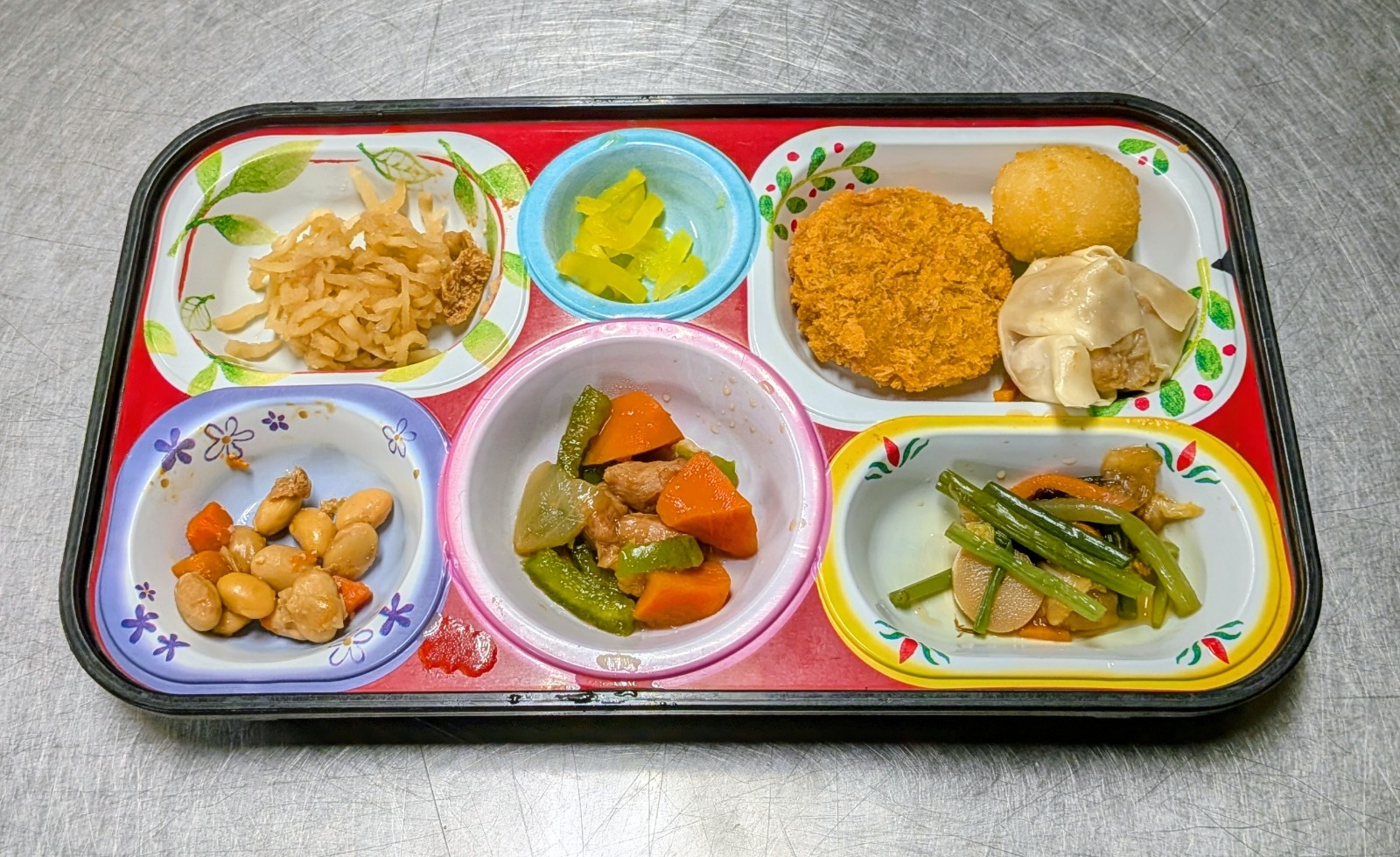 ホタテクリーミーフライ,コーンとインゲン香ばし揚げ、オムレツ、肉団子トマト煮、バジルスパゲティー、青梗菜炒め、切干大根煮