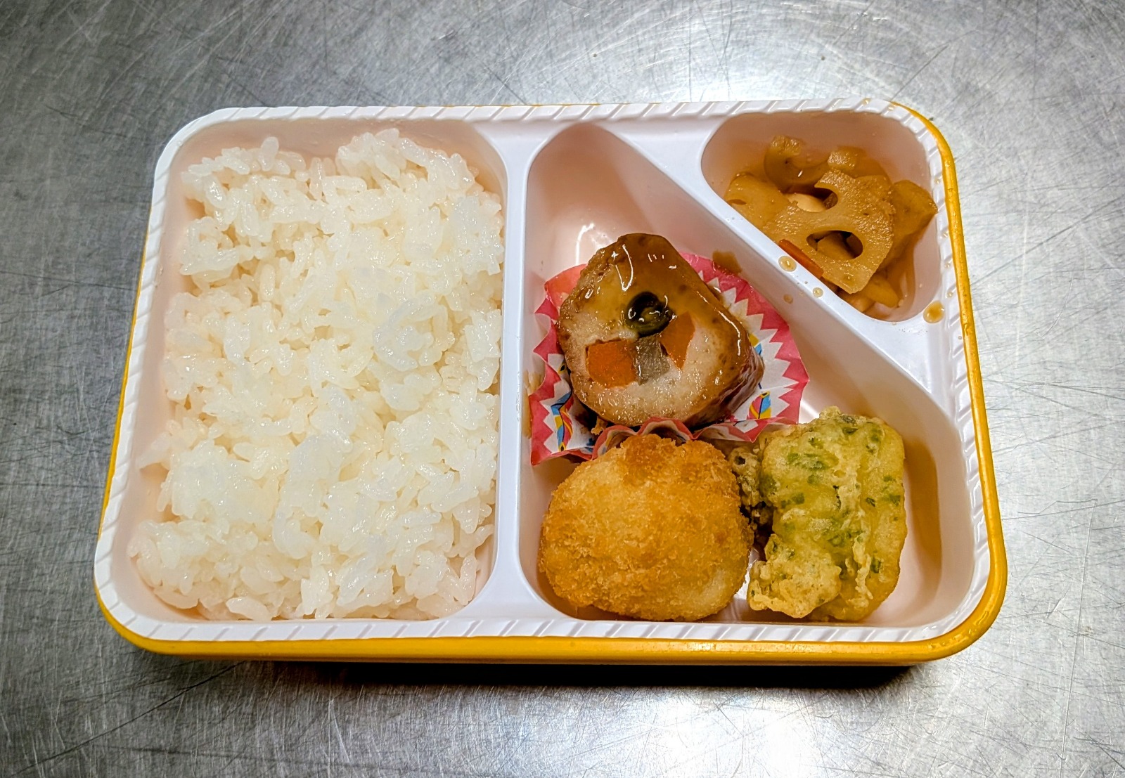 鶏肉とピーマン甘酢煮、うずら卵フライ、鰤メンチカツ、焼売、切干大根柚子ポン酢和え、白菜そぼろ煮、煮豆