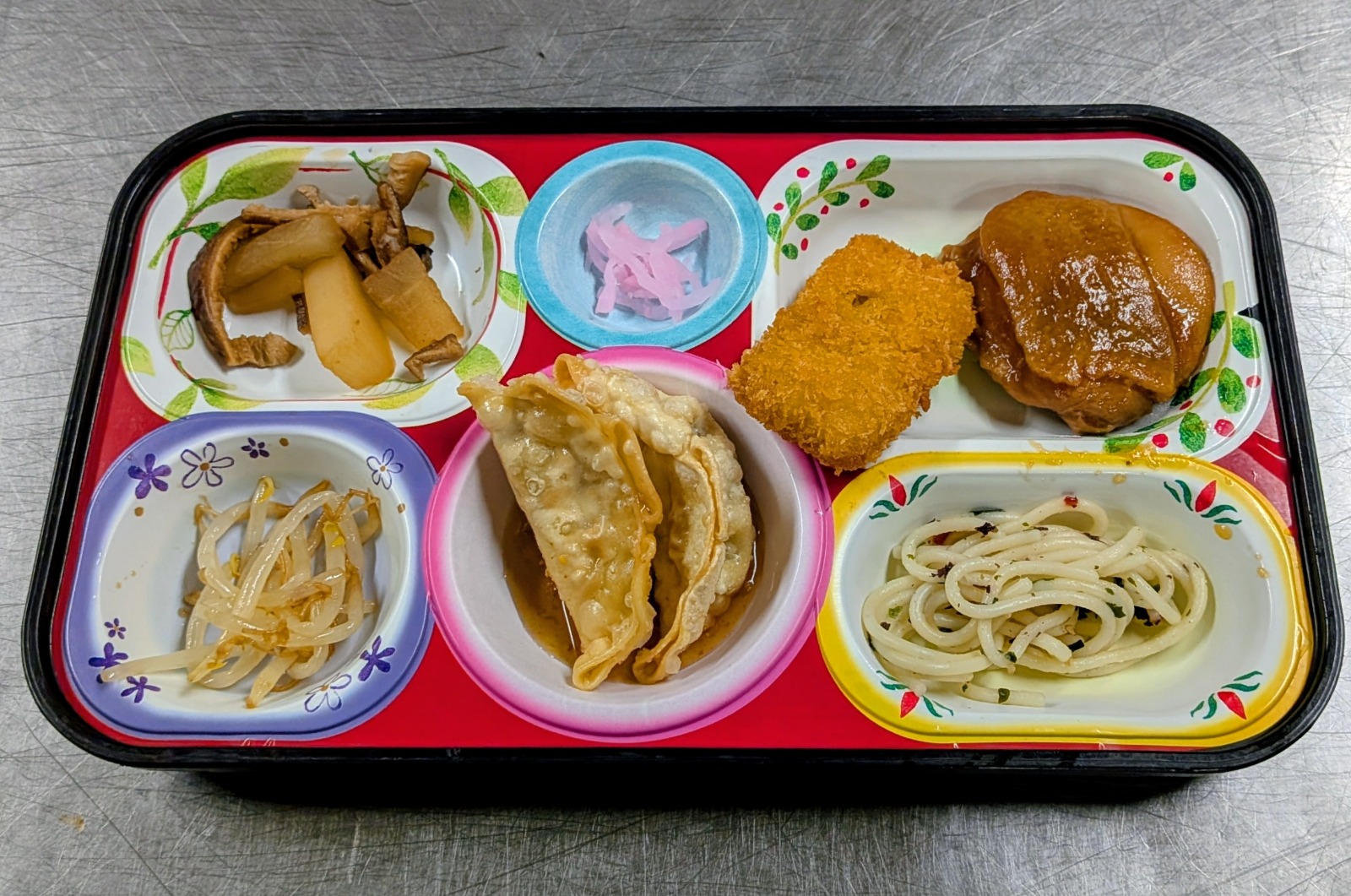 チキンステーキ、イカカツ、餃子あんかけ、和風パスタ、大根椎茸煮、もやし和え物