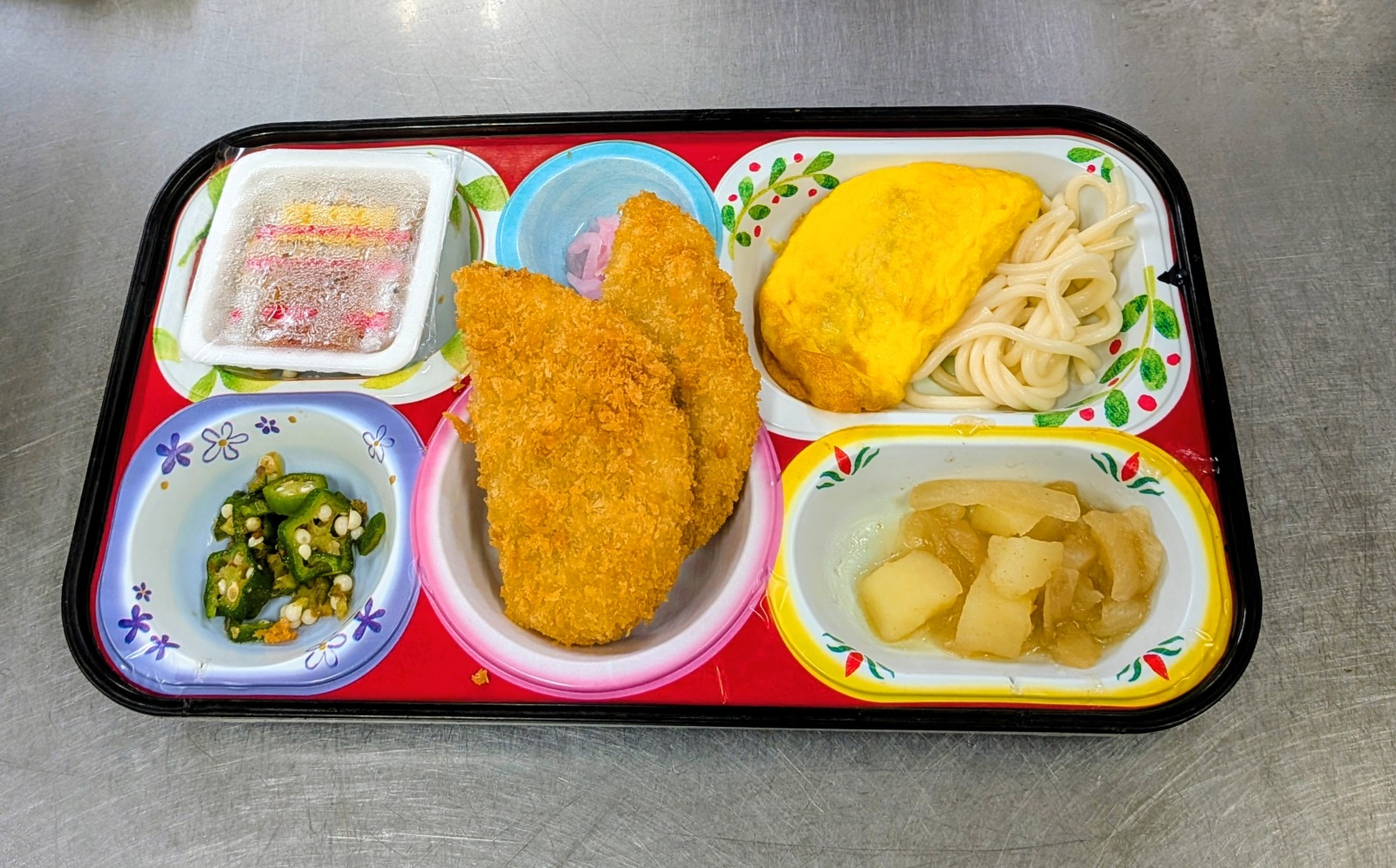 豚カツ、ミートオムレツ、フレンチサラスパ、納豆、肉じゃが、オクラおかか和え