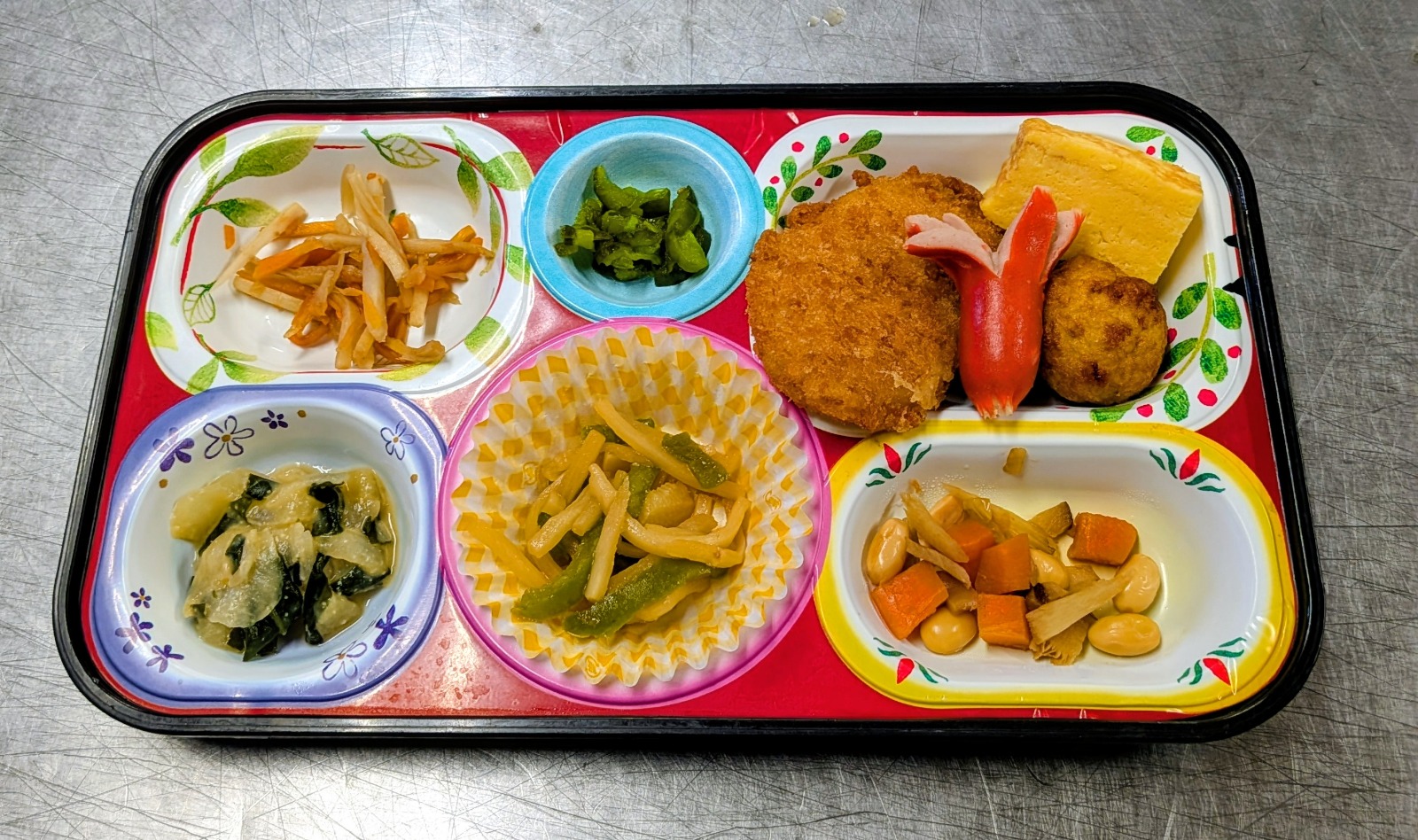 クリーミーコロッケ、タコウインナー、たこ焼き、厚焼玉子、金平牛蒡、酢味噌和え、煮豆、チンジャオロース