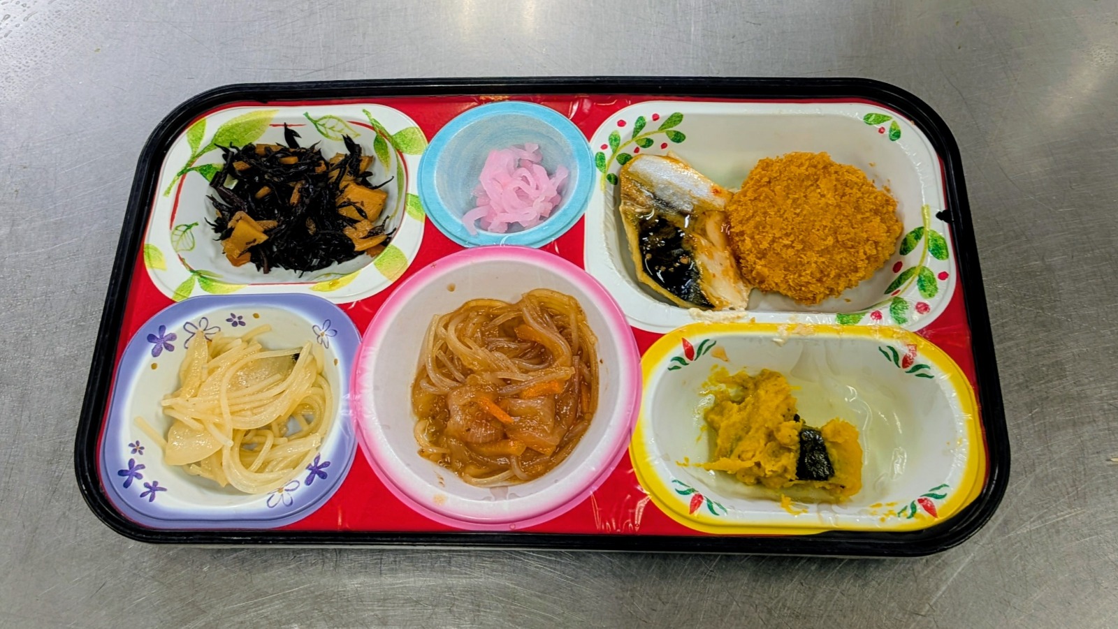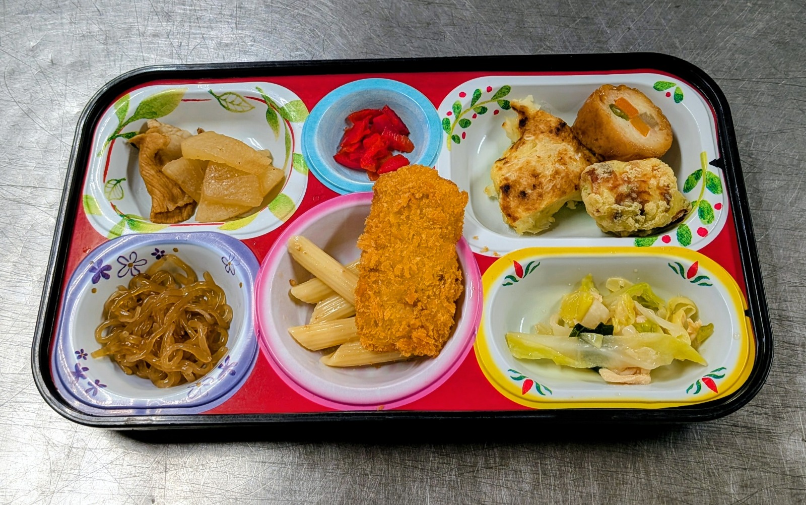 焼うどん、北あかりコロッケ、中華春巻き、揚げ半ぺん、根菜サラダ、厚揚げとキャベツ煮物、ピーマンおかか和え