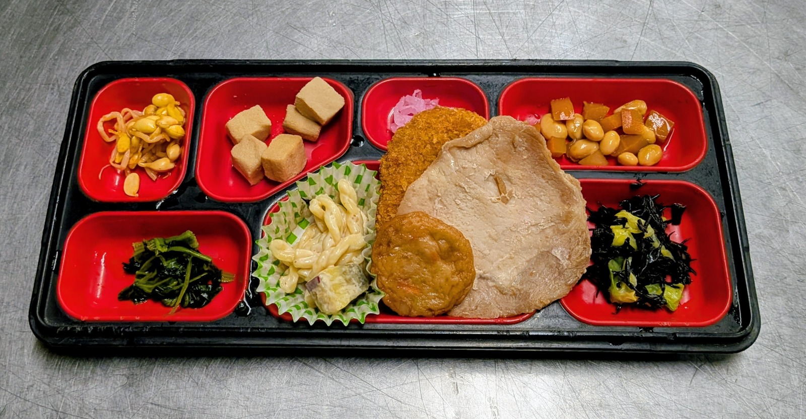 中華風蟹玉、お好み焼き、エビカツ、センキャベツ、インゲン胡麻和え、ひじきと大豆煮物、牛蒡煮物