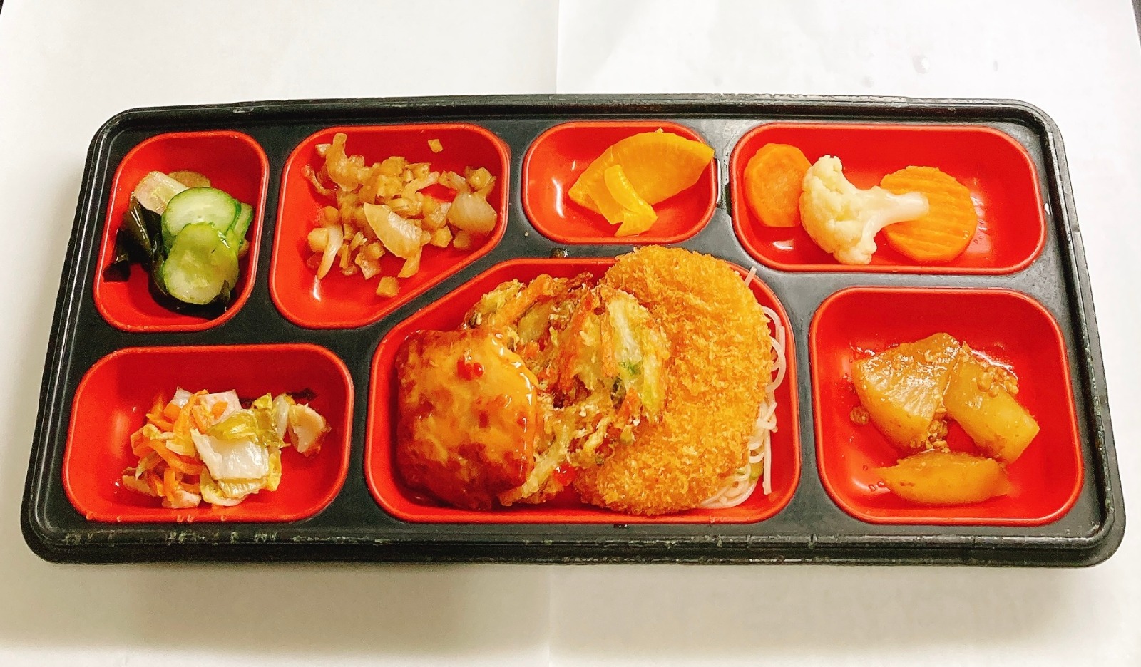 豚しゃぶ・茹で野菜、イカフライ、ささみ柚子七味、ミニハンバーグ、根菜サラダ、甘酢煮、白菜キムチ