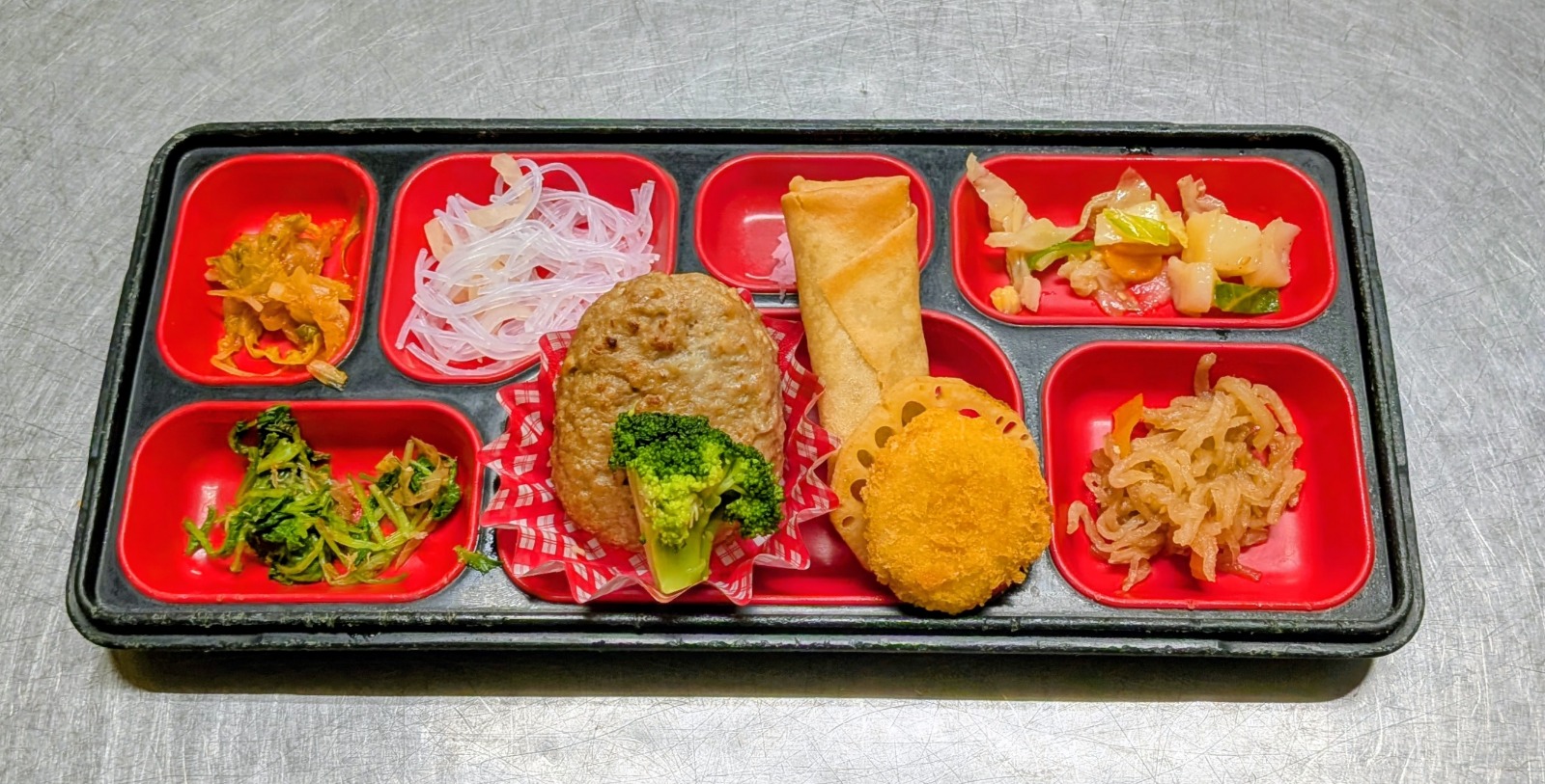 サーモン金山寺味噌漬け焼、野菜コロッケ、フライドチキン、人参グラッセ、カリフラワーサラダ、里芋煮、生酢