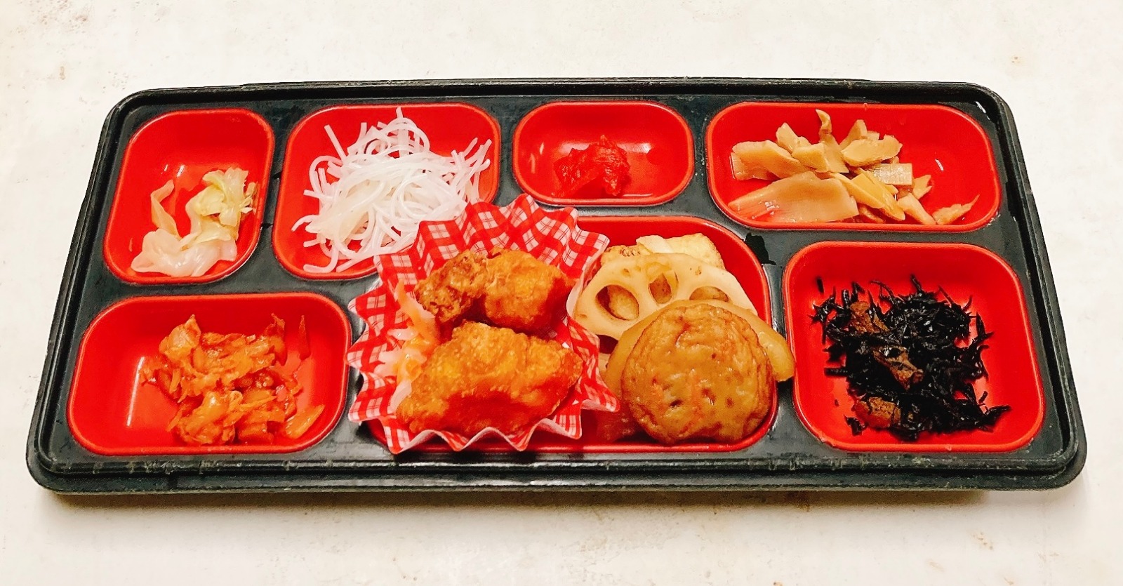 白身魚フライ、ピリ辛チキン、野菜春巻き、棒棒鶏、ペンネナポリタン、コーンサラダ、、小松菜お浸し