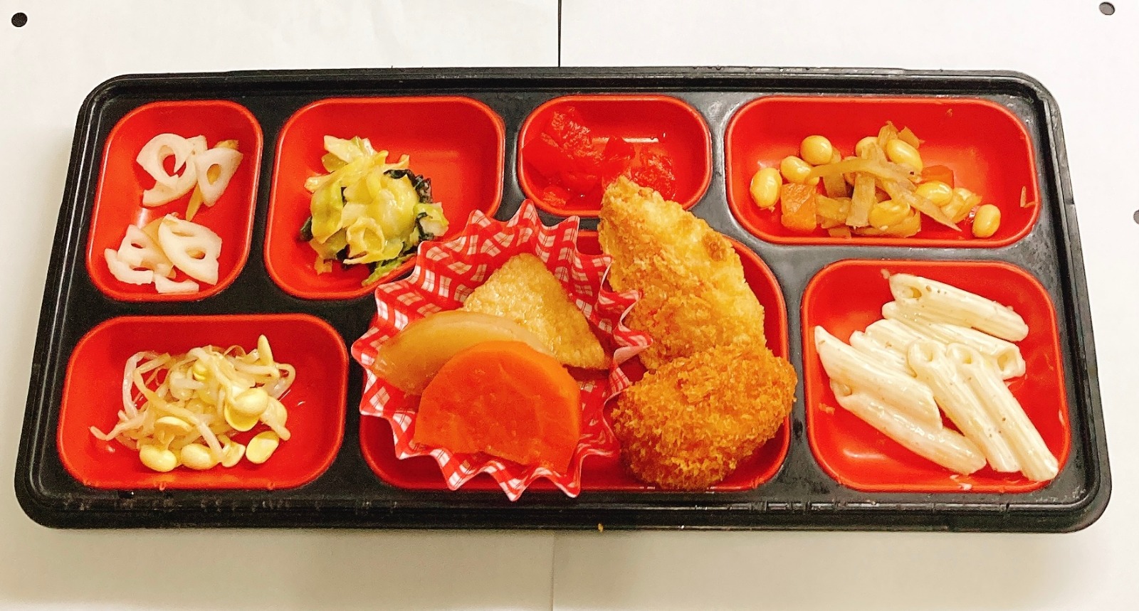 アジフライ、チーズつくね、お魚ソーセージ、厚焼玉子、トマトバジルスパゲティー、キャベツお浸し、深川煮