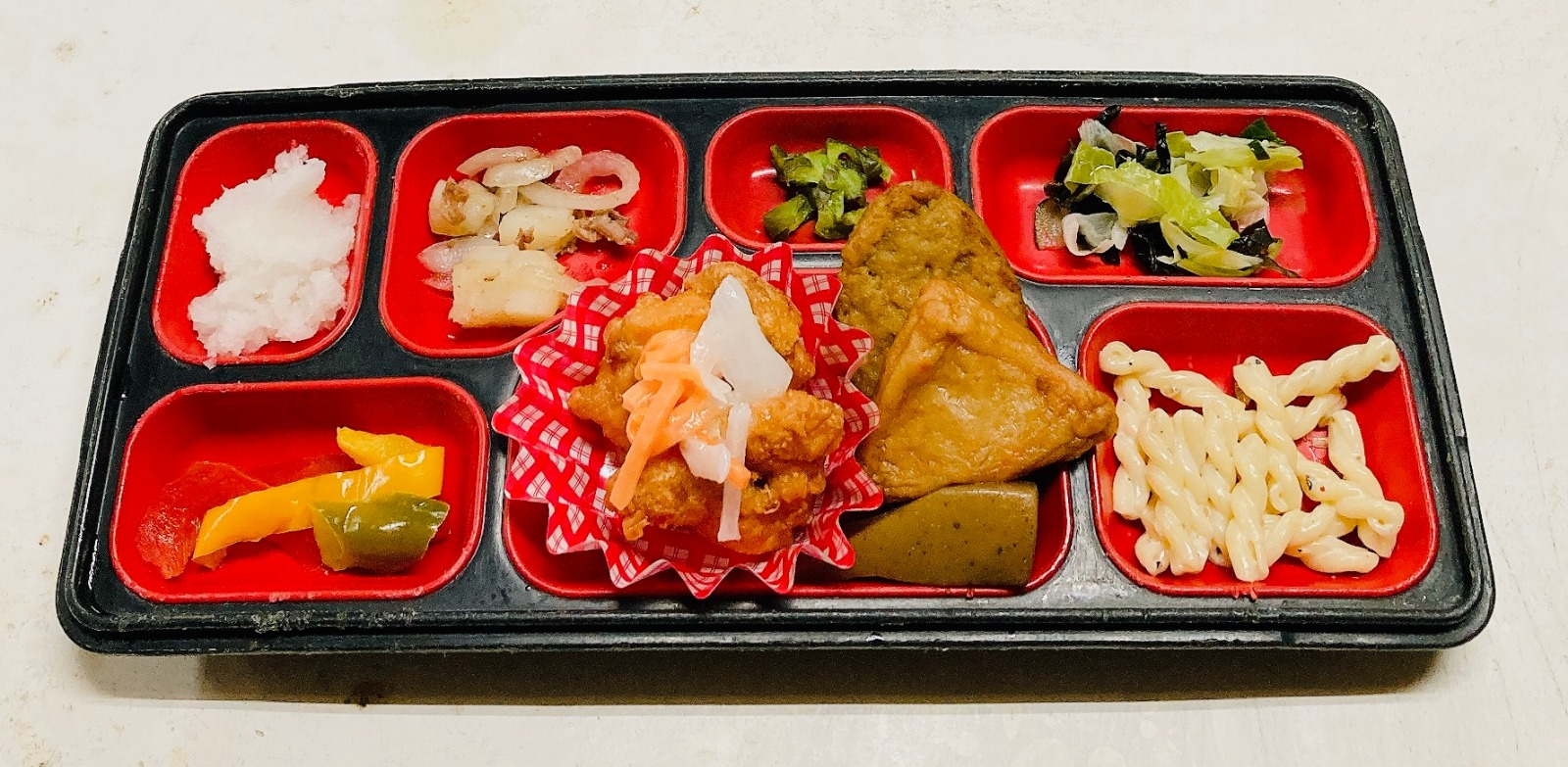 蒸し鶏と大根麻婆和え、エビフライ、ホーレン草平焼き、南瓜天ぷら、生野菜サラダ、カレー、サラダスパゲティー