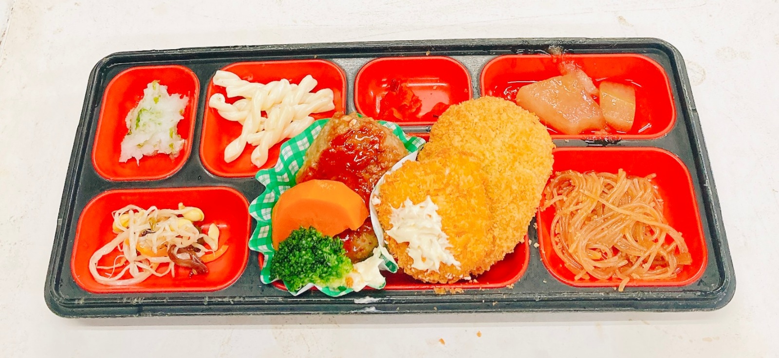 ハンバーグ、目玉焼き風オムレツ、三角カレー春巻き、花さつま、すき焼き風煮、麻婆春雨、大豆中華炒め煮