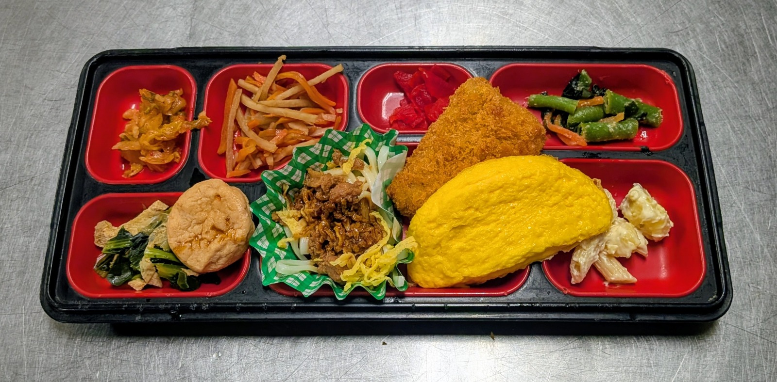 冷しきしめん、魚竜田揚げ、つくね、厚焼玉子、菊芋、イタリアンサラダ、舞茸炒め、玉子炒め