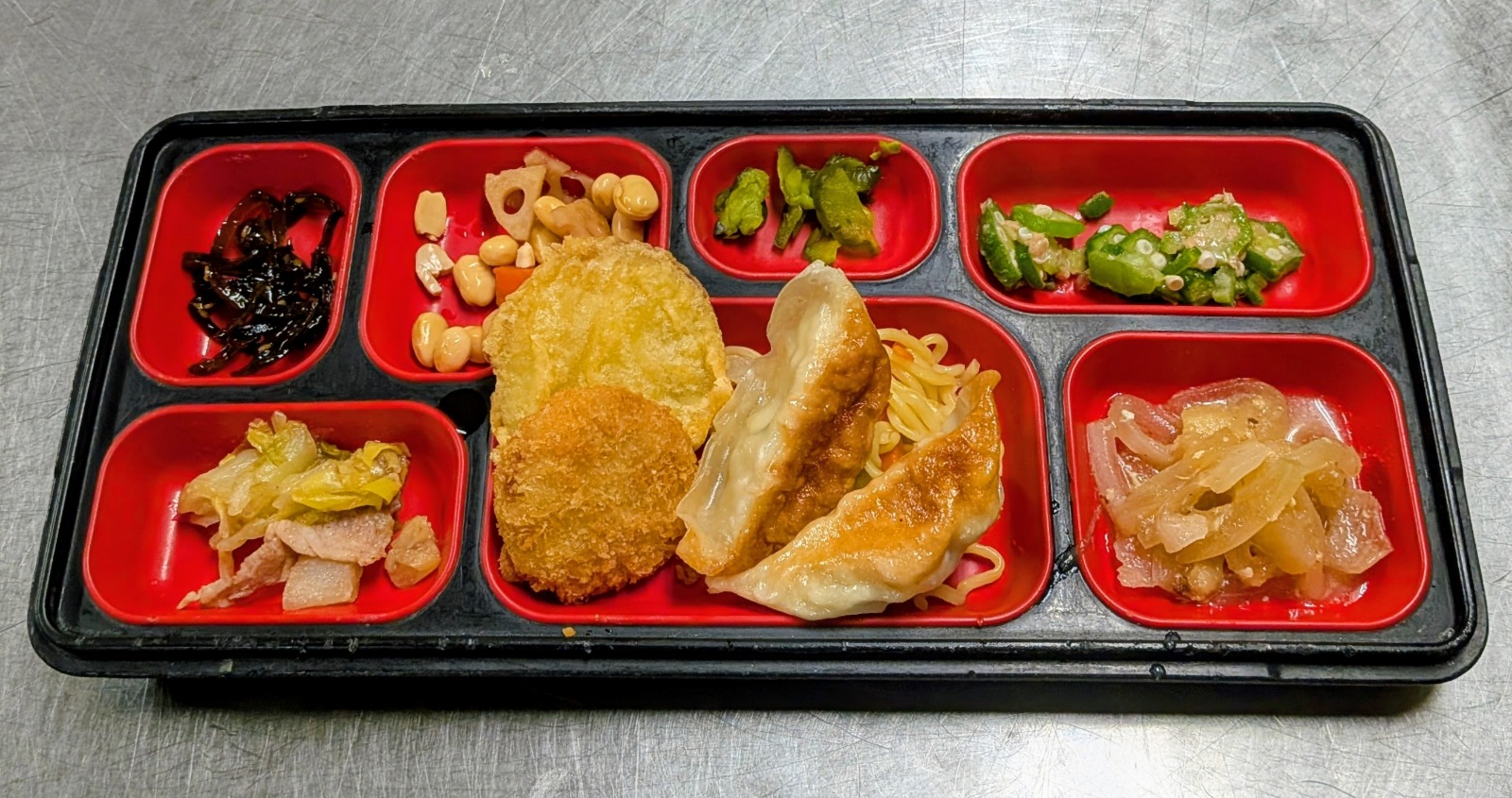 ハンバーグ、夏野菜ラタトゥイユ、メンチカツ、茄子天ぷら、マカロニボンゴレ、大根信田煮、胡瓜サラダ