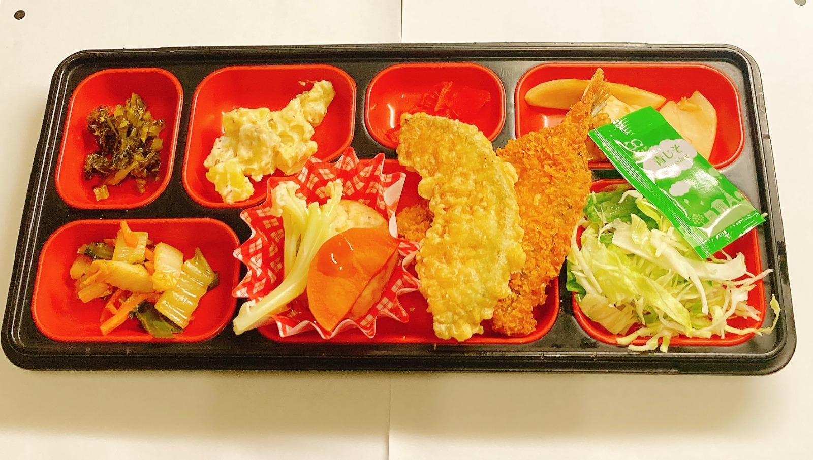 玉子サラダフライ、茄子天ぷら、味付油揚げ、肉団子のチンジャオロース、焼きうどん、大根煮、卯の花