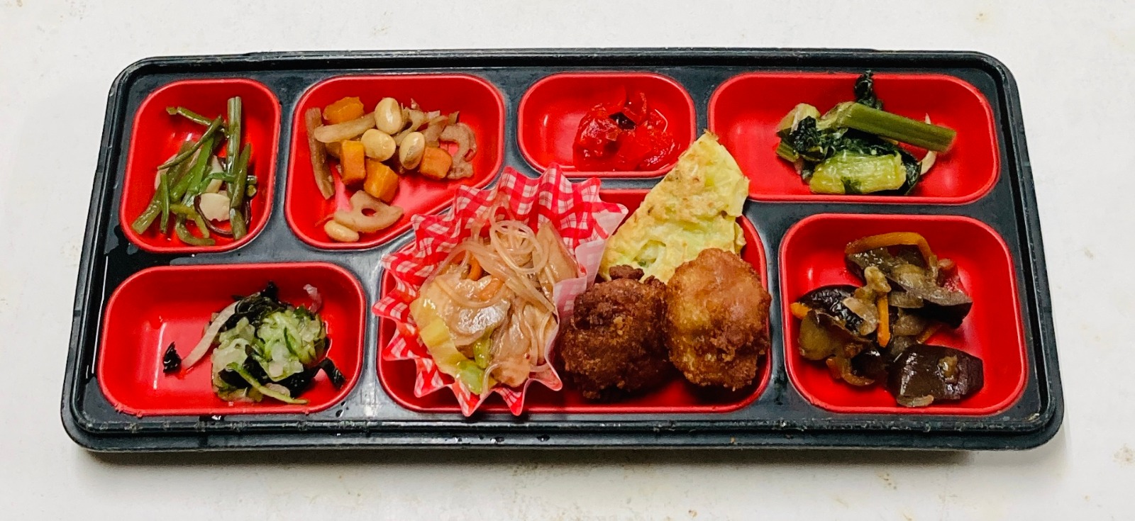 豚カツ、厚焼玉子、ロールキャベツクリーム煮、根菜サラダ、揚げ茄子中華煮、ビーフン炒め