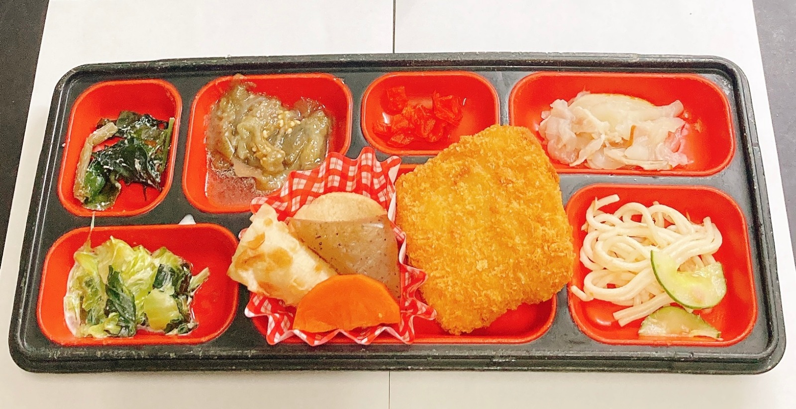 鶏唐揚げエスカベッシュ、炊き合わせ(がんも・三角蒟蒻・信田巻き・さつま芋)ひじき豆煮、春雨サラダ、白菜クリーム煮