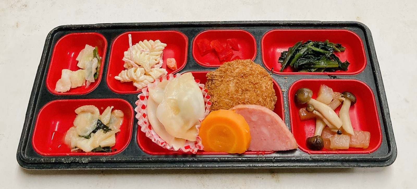 ピーマン肉詰めフライ、ハムステーキ、肉焼売、さつま芋サラダ、春雨サラダ、牛蒡煮、麻婆豆腐