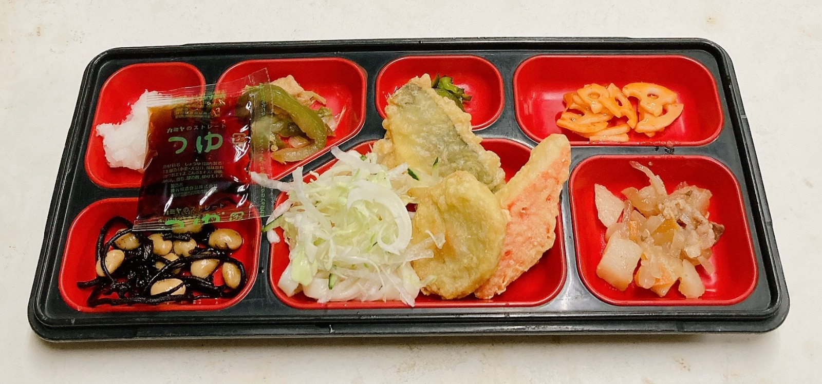カボチャコロッケ、ミートオムレツ、ウインバーグ、水餃子、和風スパゲティー、ひじき煮、オクラキムチ和え